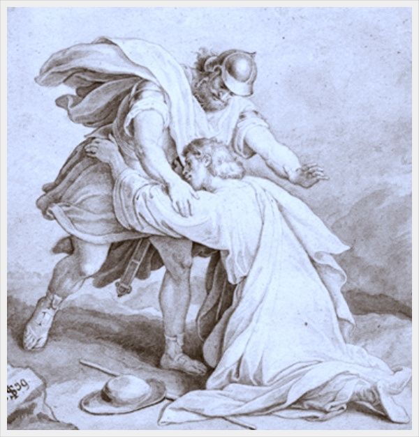 Jakob ... warf sich siebenmal zur Erde nieder, bis er nahe an seinen Bruder herangekommen war. Esau lief ihm entgegen, umarmte ihn und fiel ihm um den Hals; er küsste ihn und sie weinten. (Gen 33, 3)