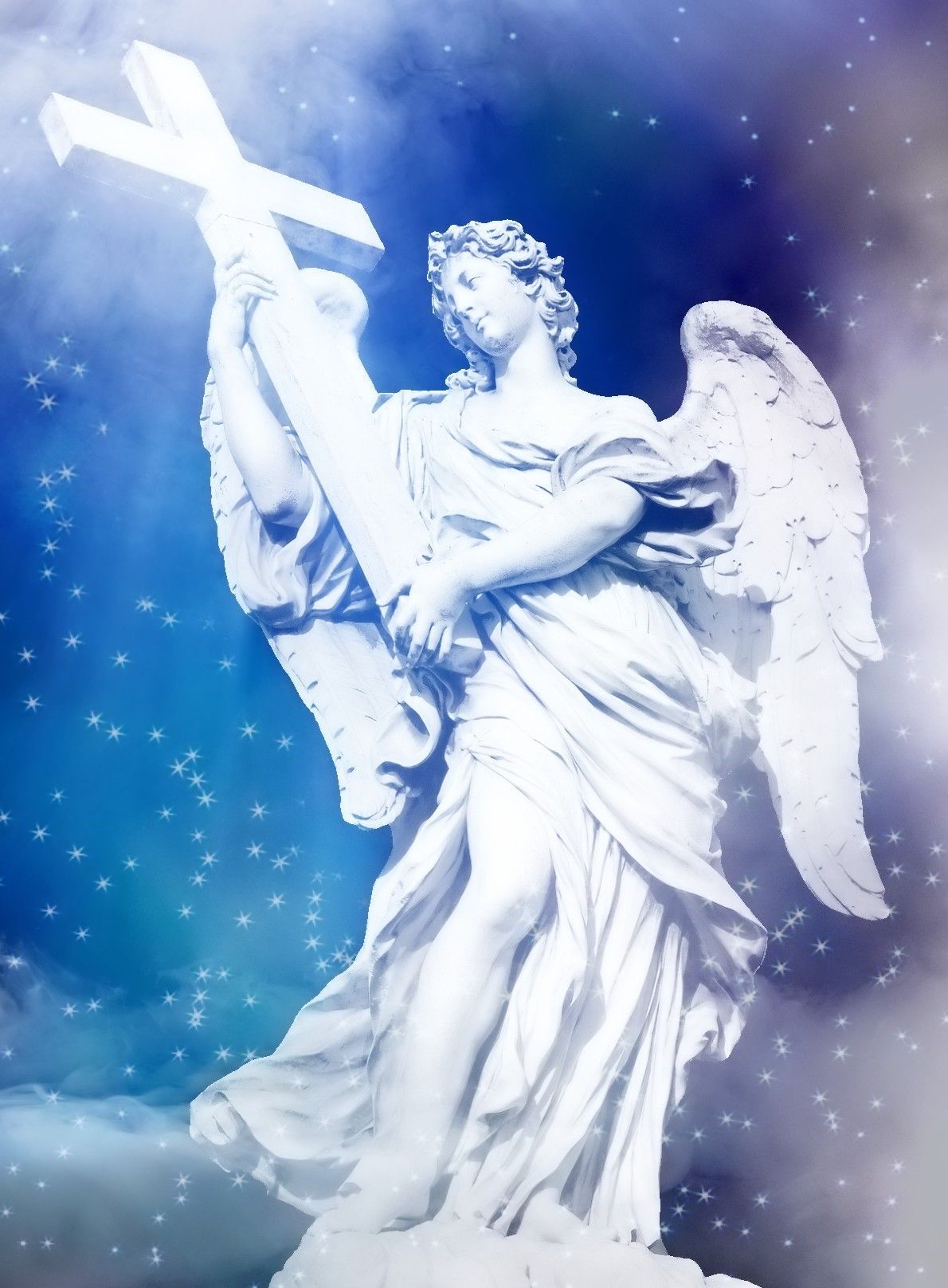 Ich trage das Kreuz der Aussöhnung zwischen Gott und den Menschen in meinen Armen, denn ich bin der Engel der Versöhnung. Durch den Kreuzestod Jesu Christi hat Gott alle Menschen mit sich versöhnt. Nun ist es an den Menschen, sich untereinander zu versöhnen und sich in geschwisterlicher Liebe zu begegnen. Jetzt, vor der Ankunft des HERRN, ist vielleicht der richtige Augenblick, Streitigkeiten und Unfrieden aus der Welt zu schaffen. Misstrauen, Neid, Rache oder gar Hass beschädigen jedes Menschenherz; Versöhnung salbt es, damit es heilen kann. So salbe auch du die Herzen deiner Mitmenschen. Die sieben Gaben des Heiligen Geistes können dir dabei helfen: