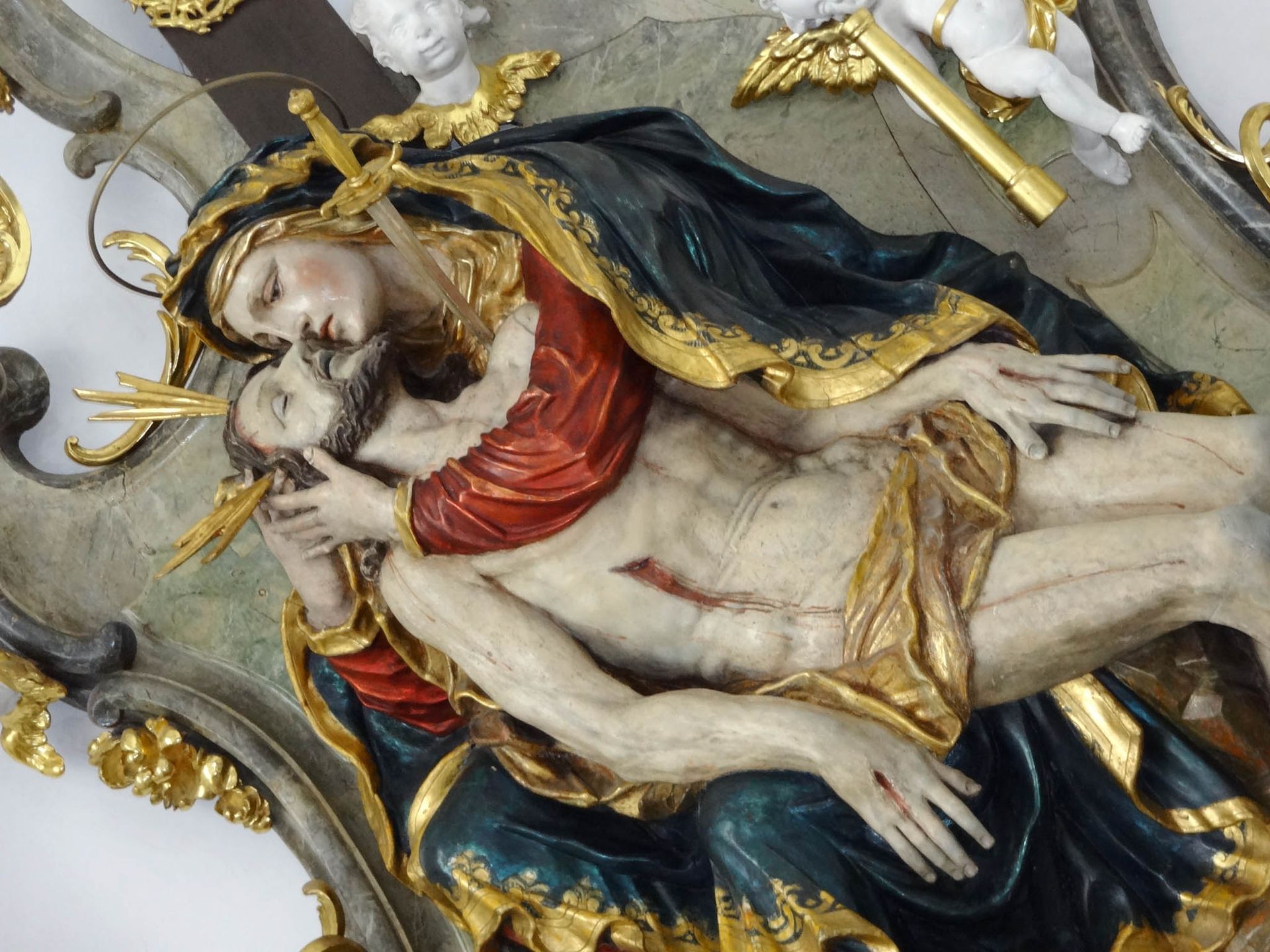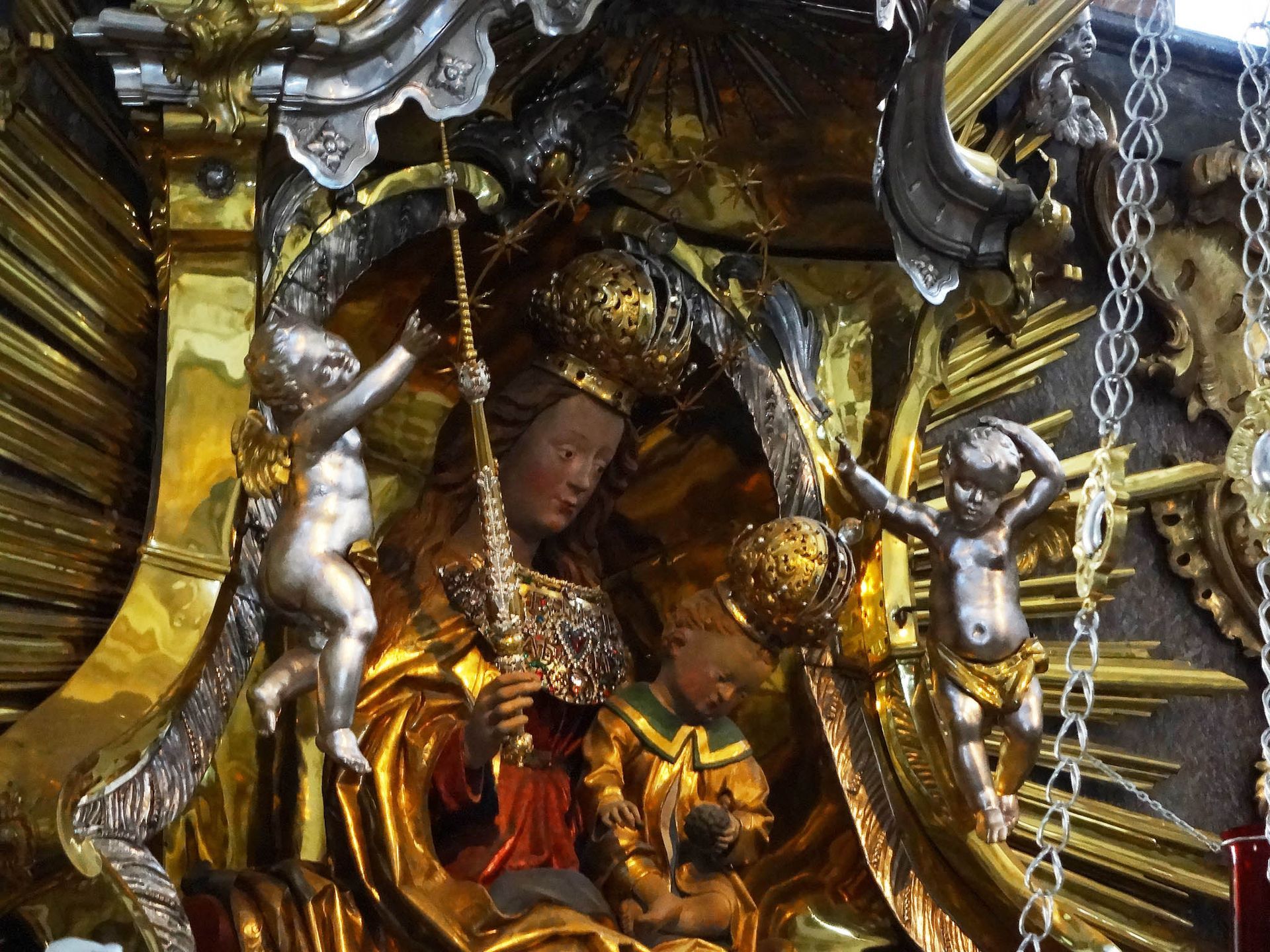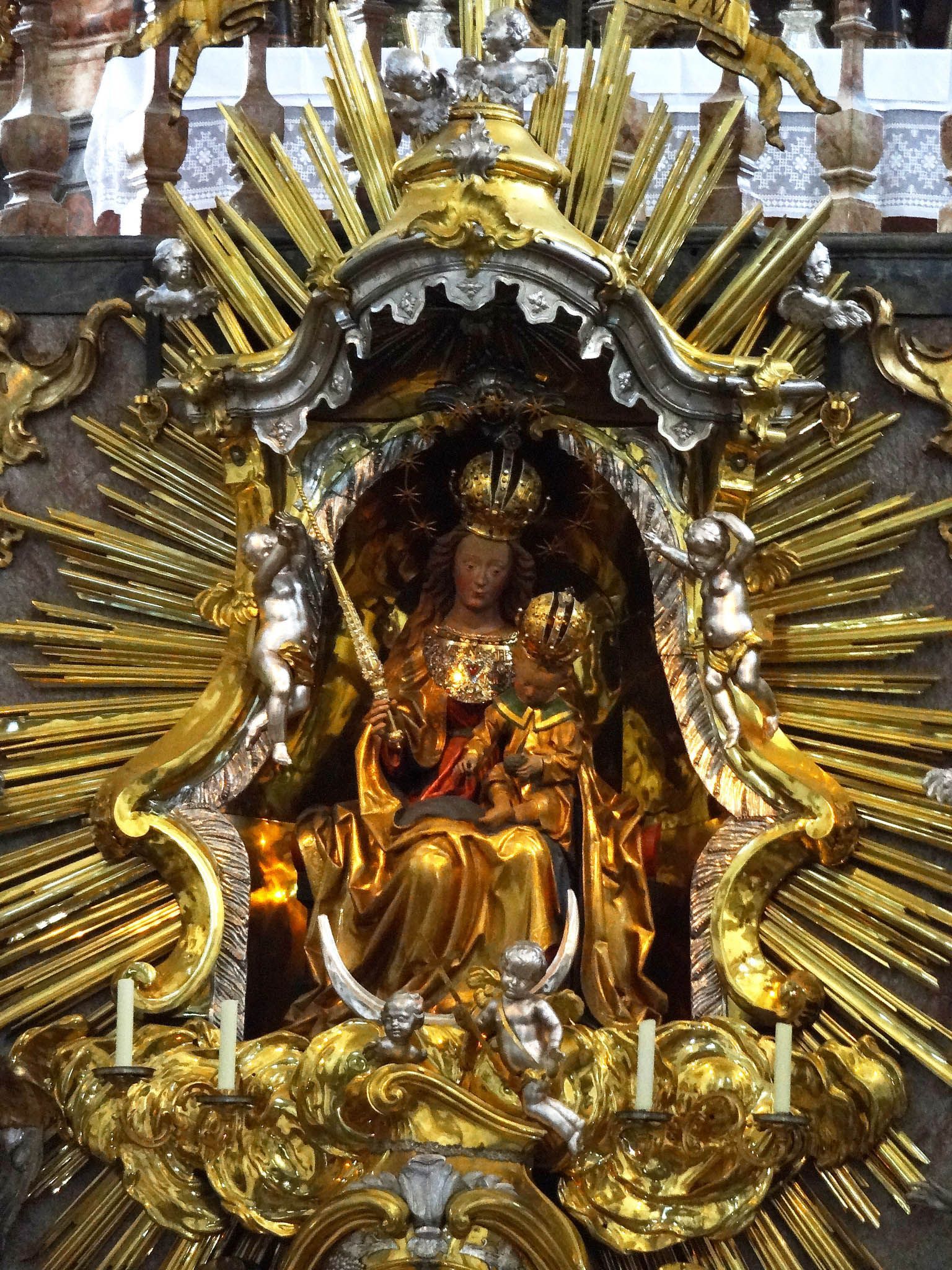 Andechser Gnadenbild - Madonna mit Jesuskind, das eine Beere von einer Traube pflückt (Deutung: Wie aus der Beere roter Saft fließt, wenn man sie zerdrückt, so wird Jesu Blut fließen für das Heil aller Menschen)