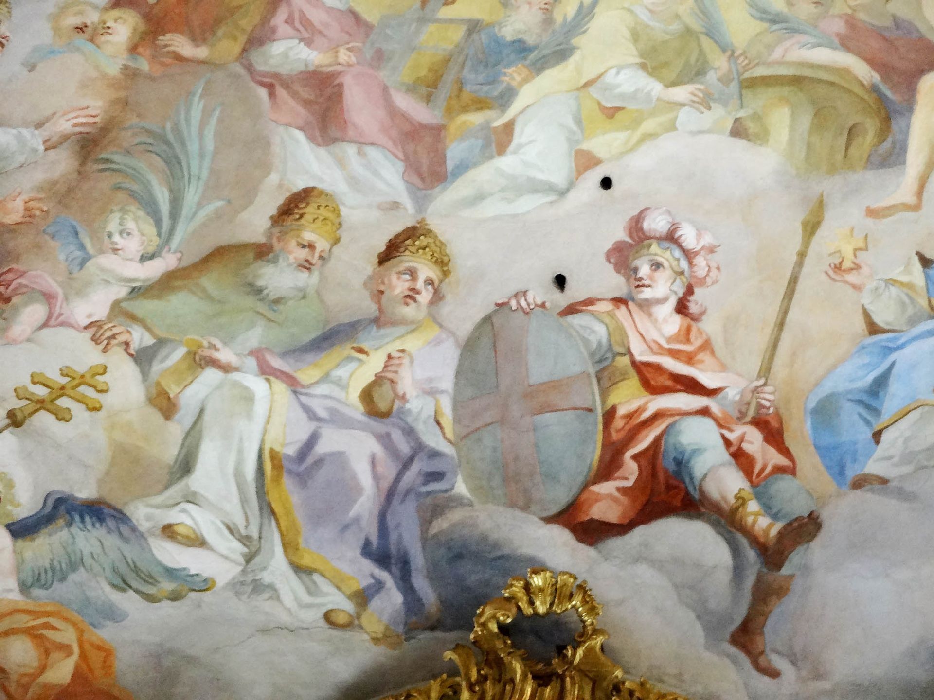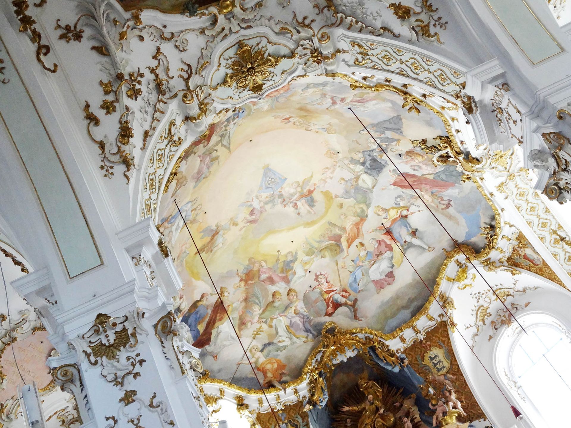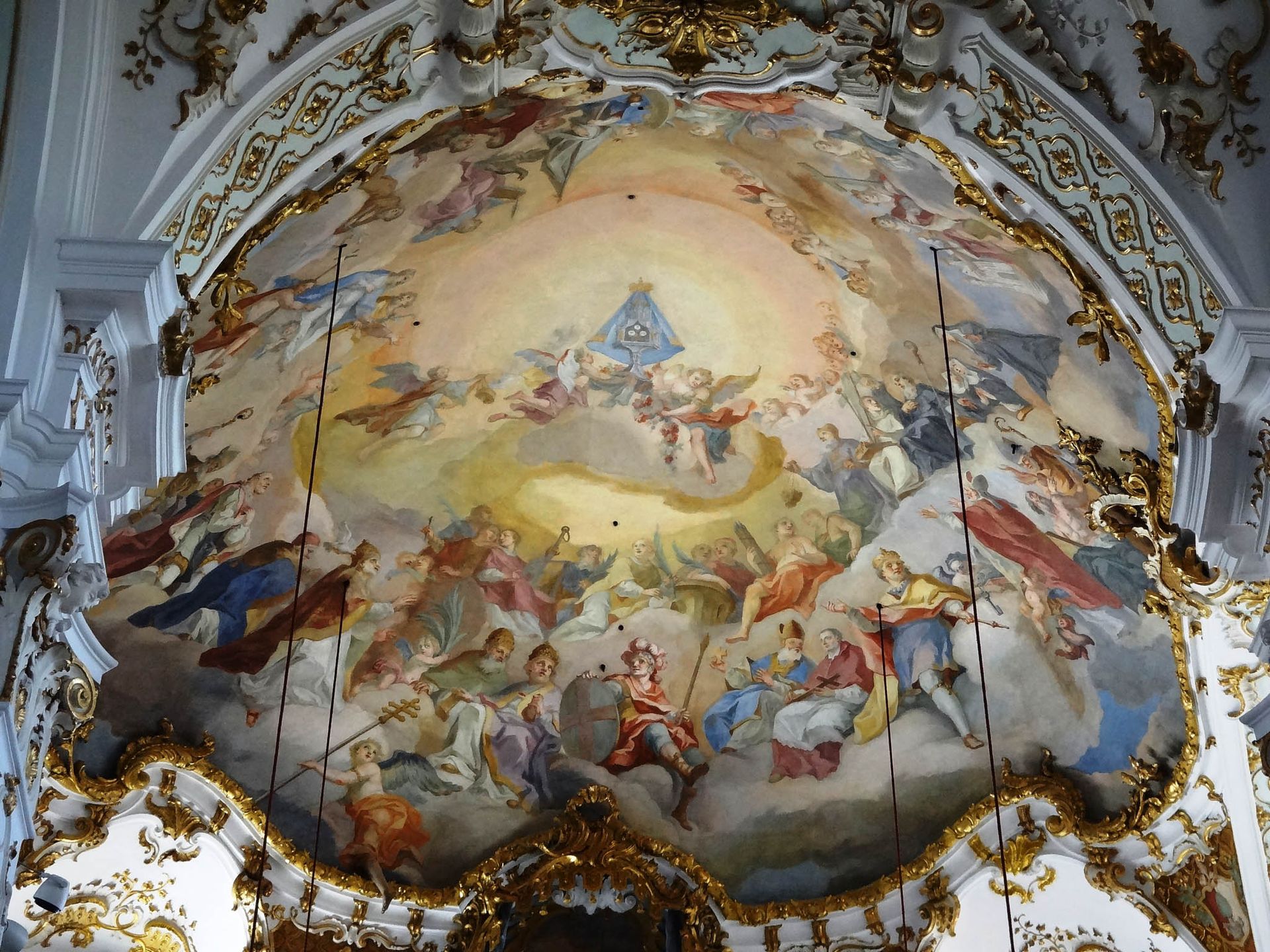 "Andechser Heiligenhimmel" Deckenfresko von J. B. Zimmermann 1755 zeigt die drei Heiligen Hostien und darunter alle Heiligen die in Zusammenhang mit Andechs und dem Reliquienschatz stehen