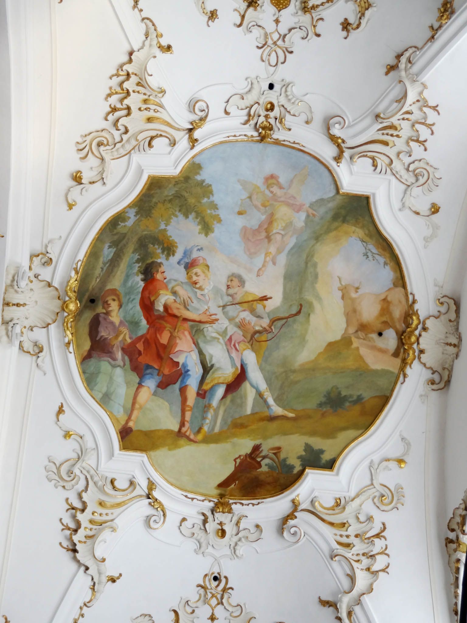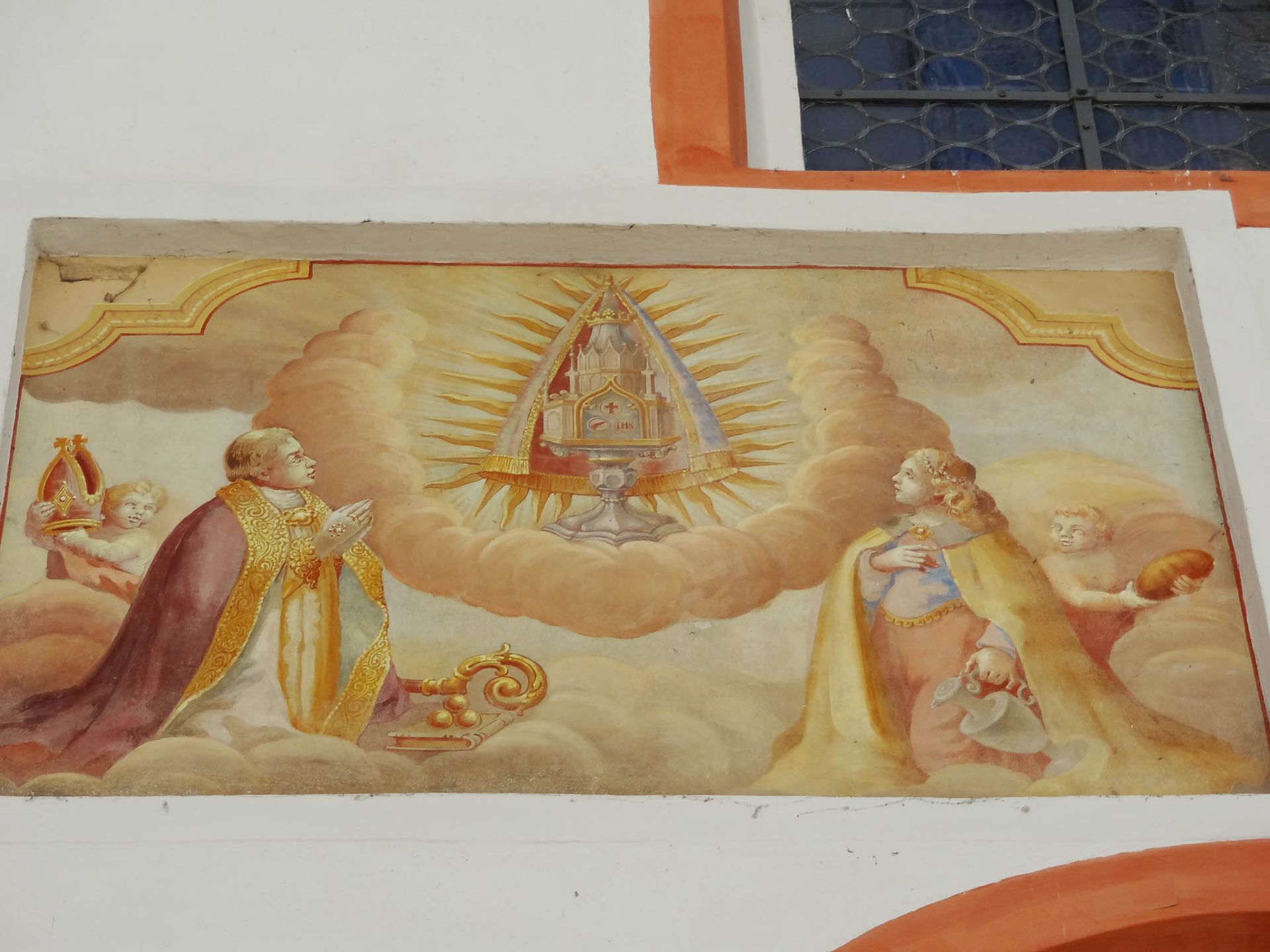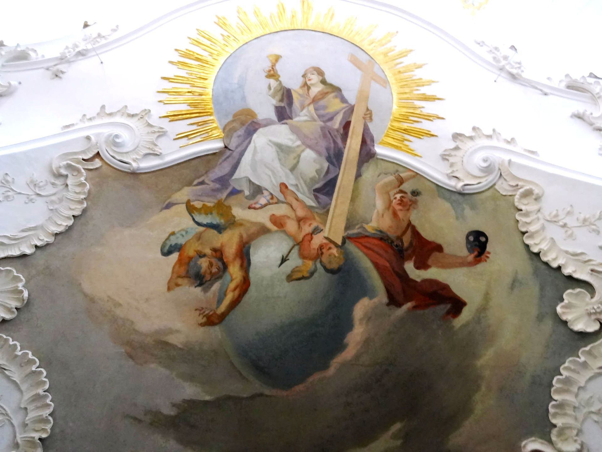 "Andechser Heiligenhimmel" Deckenfresko von J. B. Zimmermann 1755 zeigt die drei Heiligen Hostien und darunter alle Heiligen die in Zusammenhang mit Andechs und dem Reliquienschatz stehen