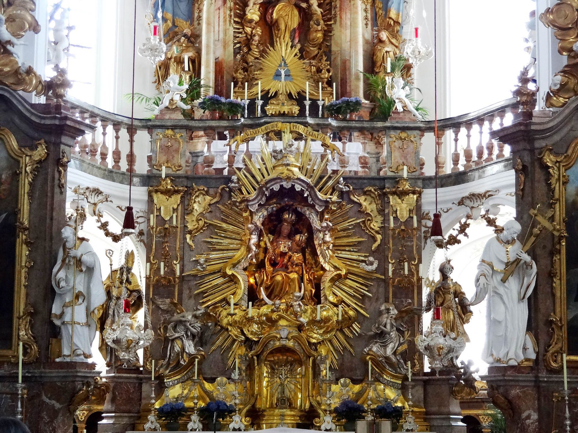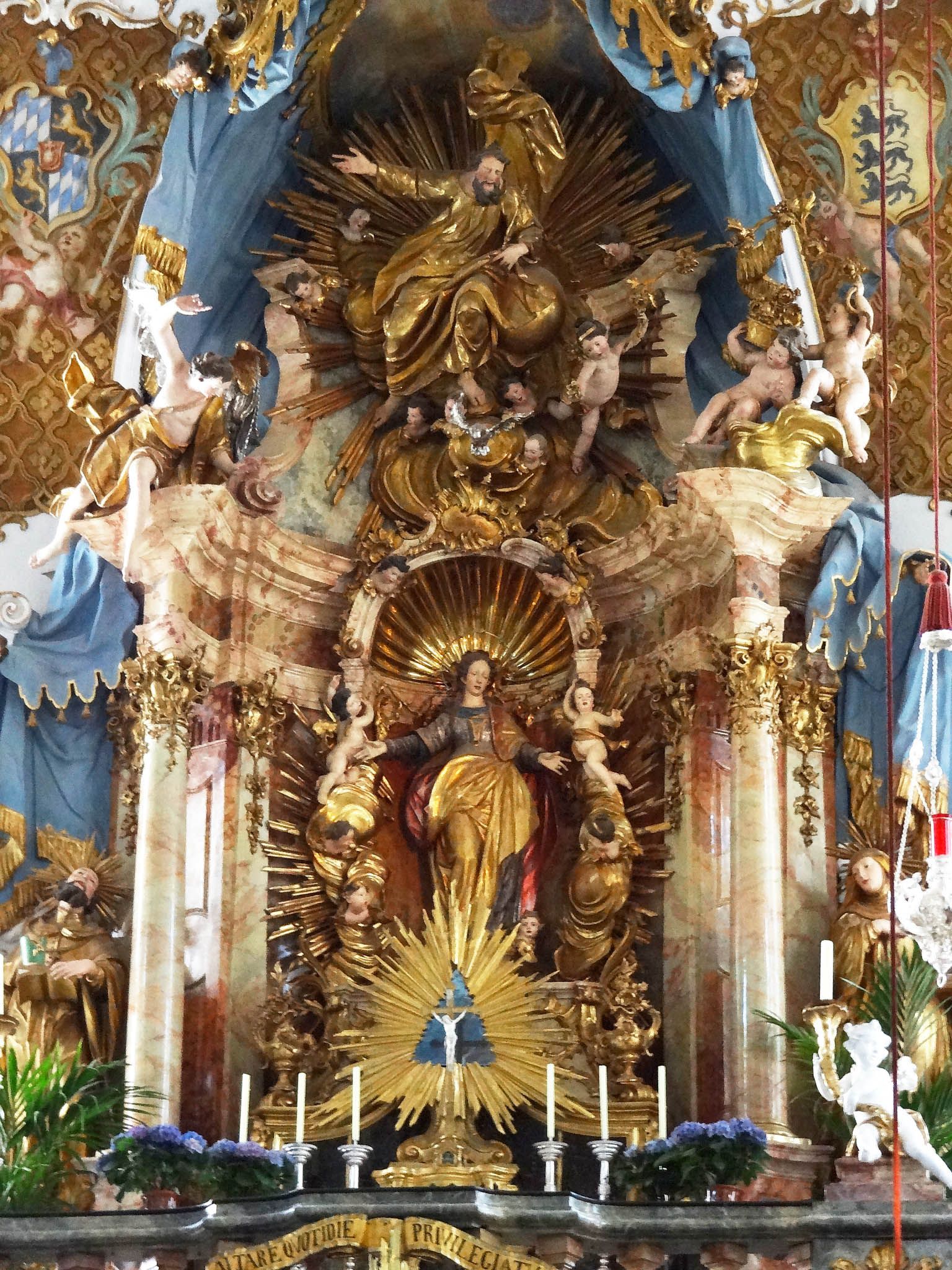 Sieht man genau hin, fällt auf, dass es eigentlich zwei Kirchen sind. Auf Grund von Platzmangel auf dem Berg war der Bau einer separaten Klosterkirche für die Mönche nicht möglich, so integrierte man die Klosterkirche (ab Empore oberer Kirchenraum) einfach in die Wallfahrtskirche (unterer Kirchenraum), daher auch der ins Zentrum gerückte zweifache Hochaltar, der im unteren Bereich das Andechser Gnadenbild - Madonna mit Jesusknaben - zeigt, im oberen Bereich die Verkündigungsmadonna.