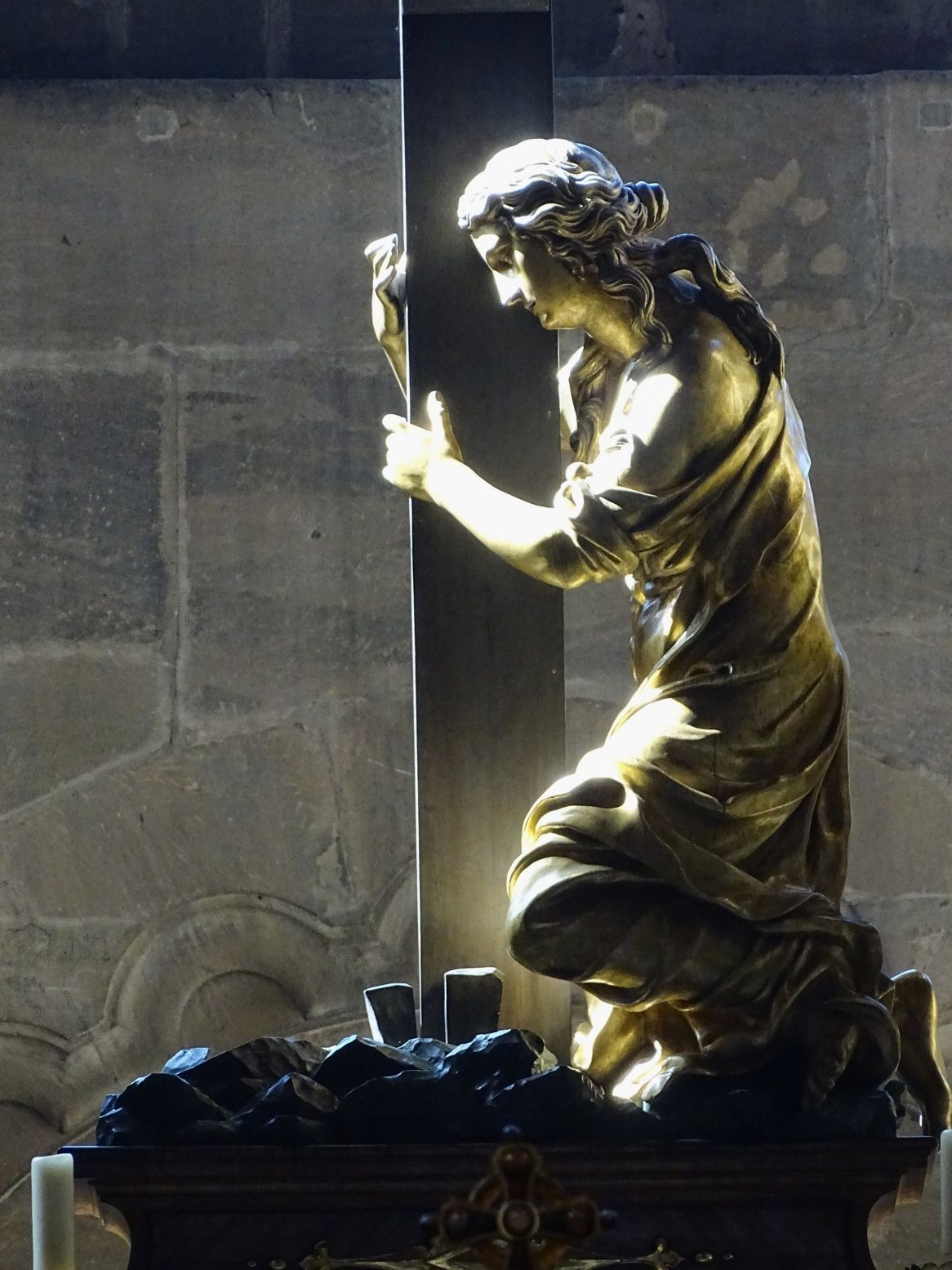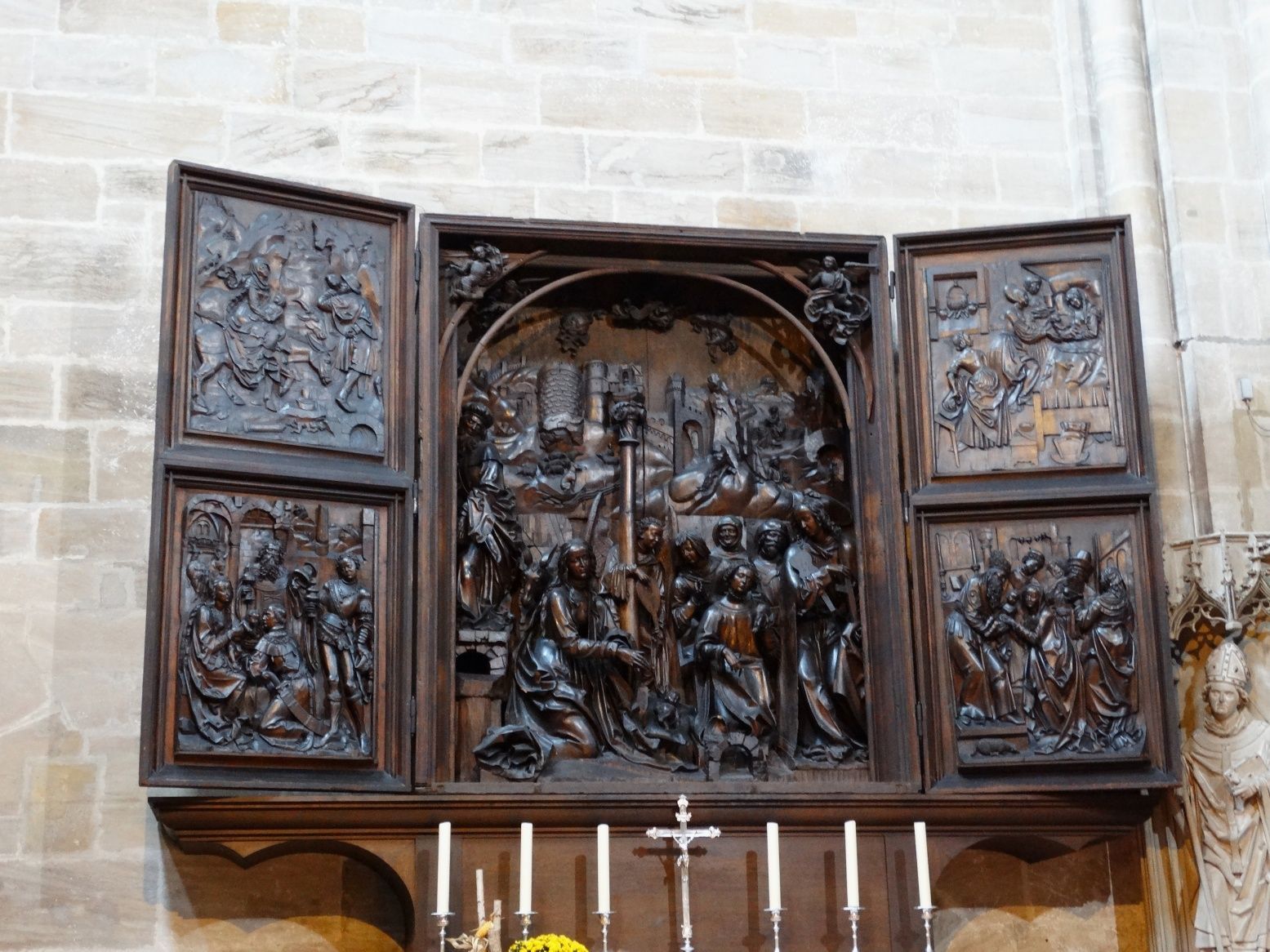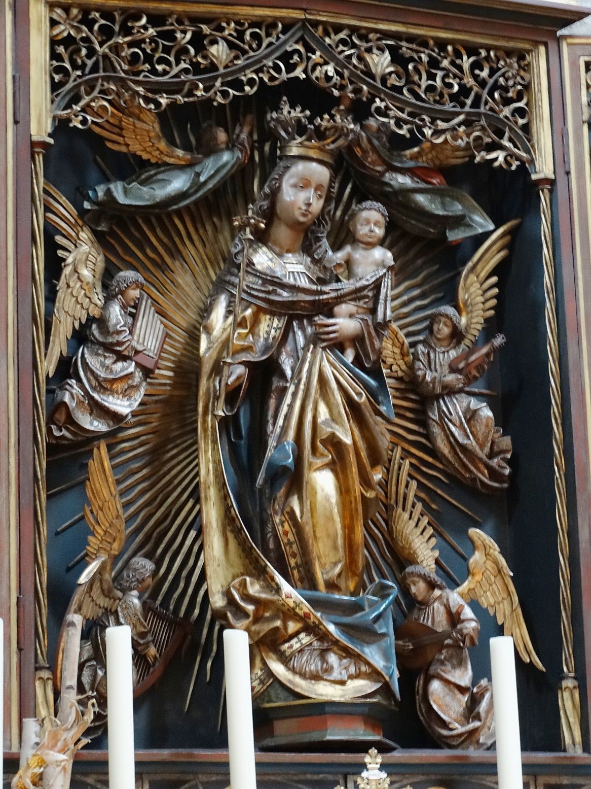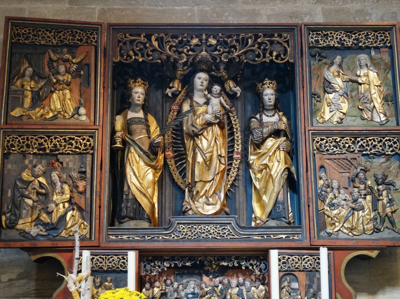 Marienaltar von Veit Stoss aus Tannen- und Lindenholz um 1520 zeigt wichtige Stationen aus dem Leben Marias; hervorzuheben ist der Engel am rechten Bildrand in der Krippendarstellung, der ein Kreuz als Hinweis auf den Leidenstod Jesu trägt