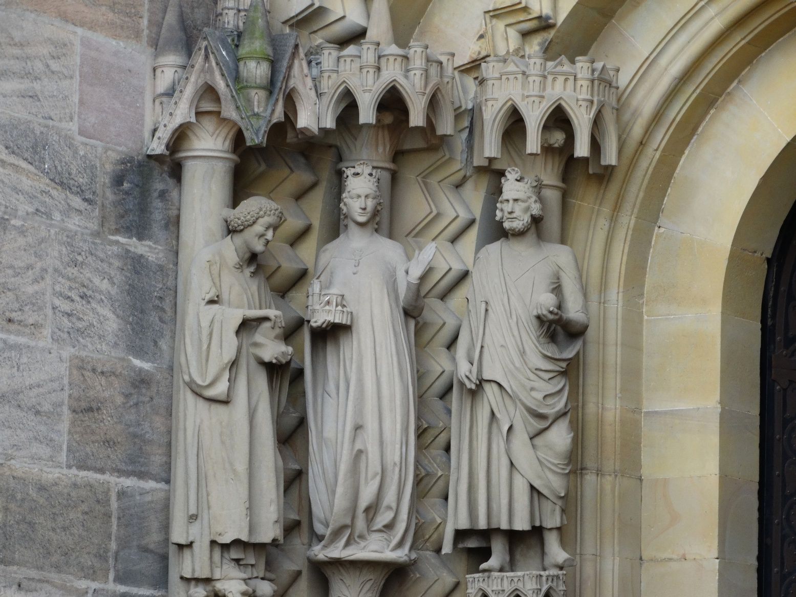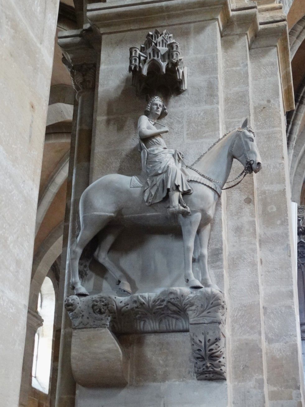 >> Der weltberühmte "Bamberger Reiter", geschaffen von einem unbekannten Künstler 1235; bis heute kann nicht bestimmt werden, wen diese Figur erhobenen Hauptes zur Pferde darstellen will