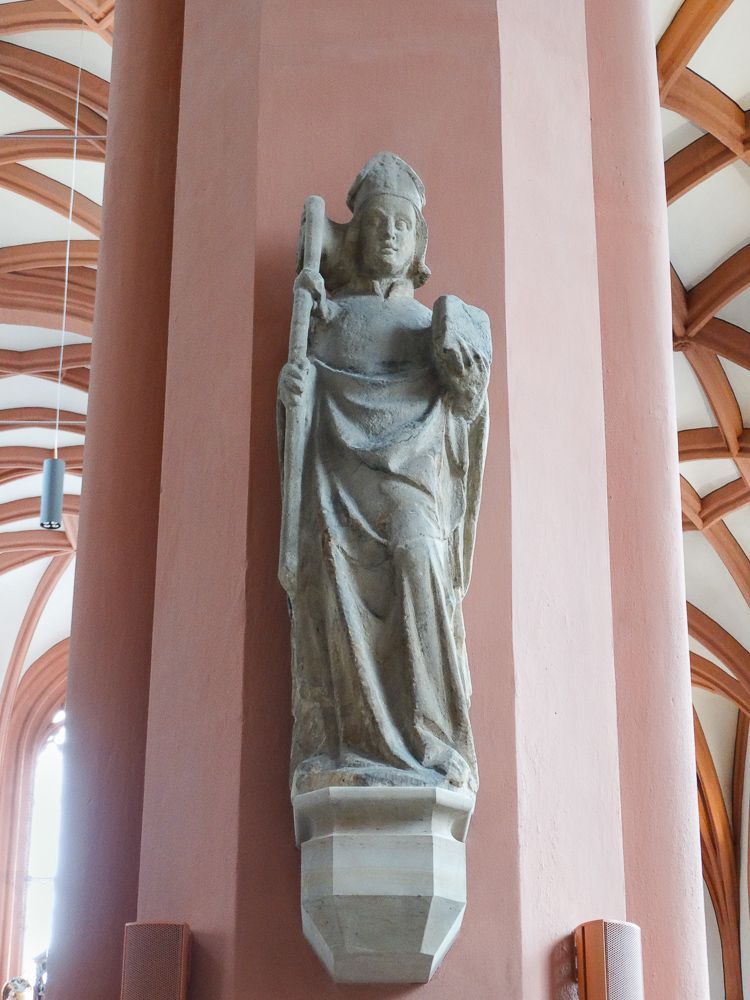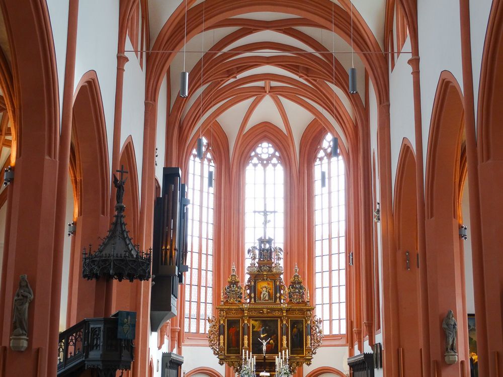 Im Innern besticht der dreischiffige Bau heute besonders durch das spätgotische terrakotta-farbene Kreuzrippengewölbe. Viele barocke Ausstattungsstücke wurden 1871 während einer Renovierung entfernt. Lediglich der Hochaltar im Barock/Renaissance Stil, der Taufstein mit Motiven aus dem Alten und Neuen Testament und einige Epitaphsteine sind erhalten geblieben.