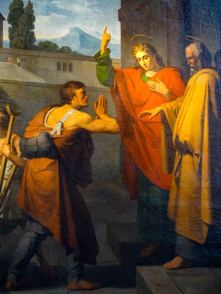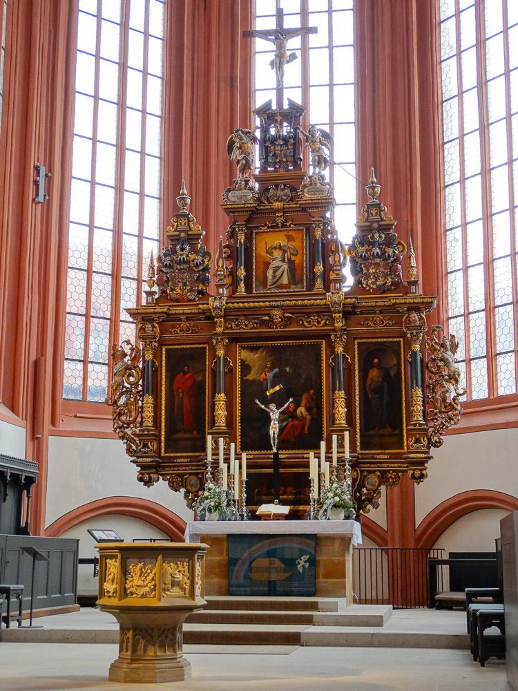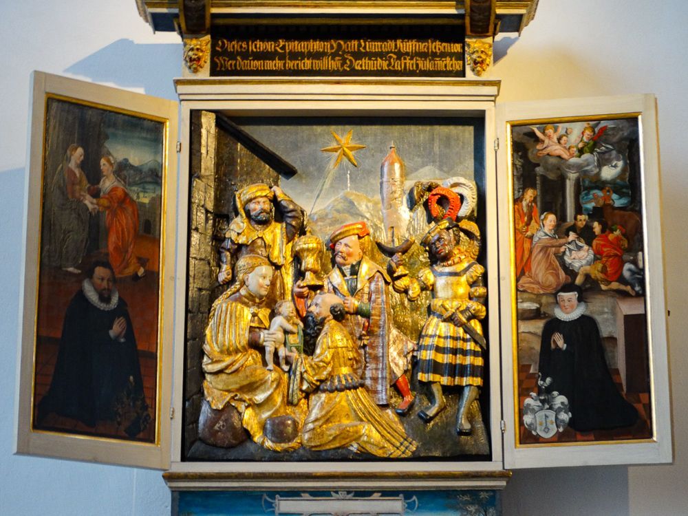 << Hochaltar im Barock/Renaissance Stil von 1615 mit feinem Schnitzwerk; Bilderszenen "Abendmahl", "Jesus im Garten Gethsemane" und "Auferstehung Jesu" von August Riedel um 1800
