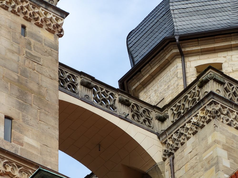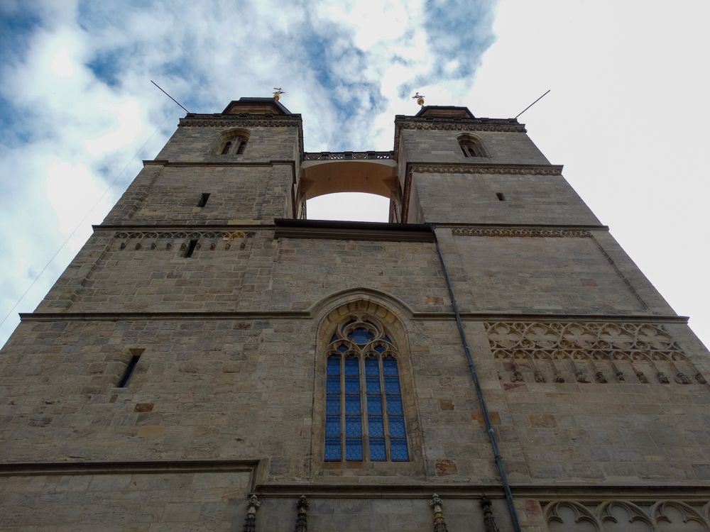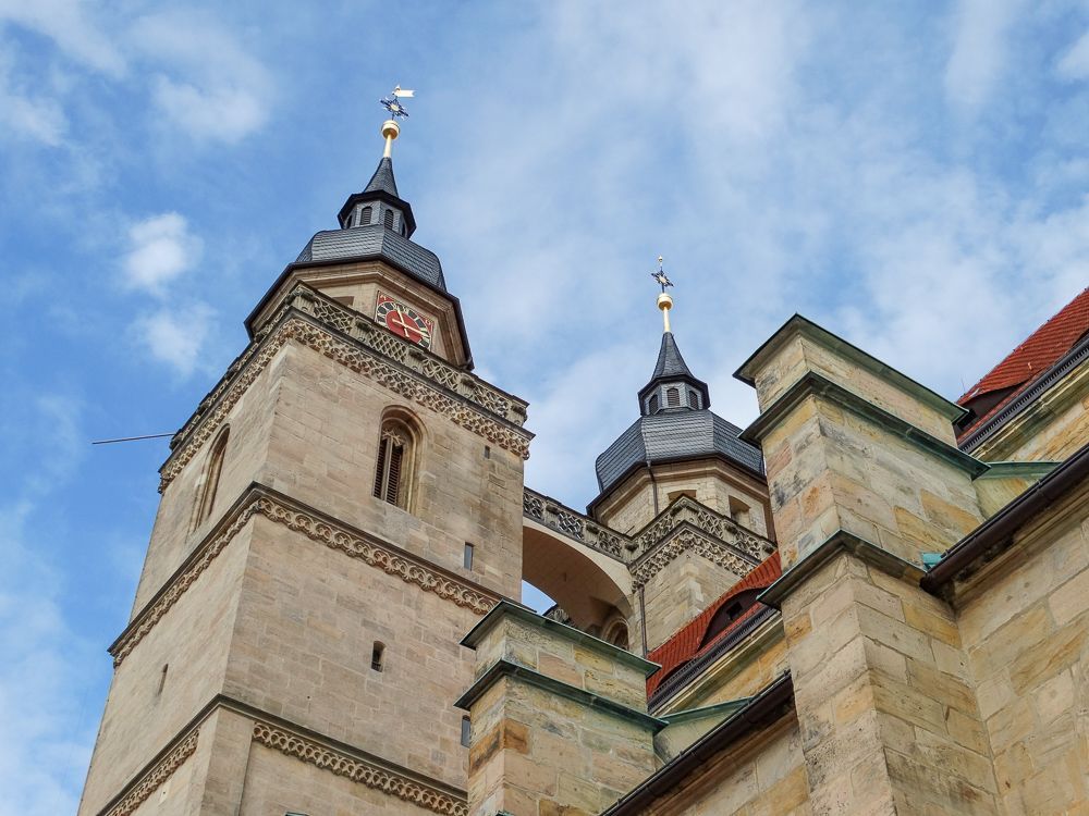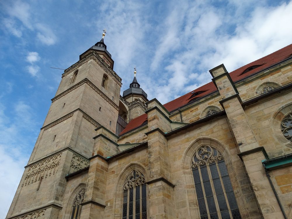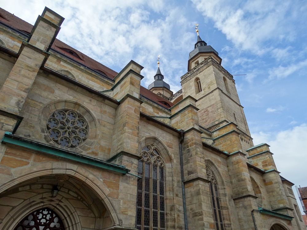 BESCHREIBUNG: Die Stadtkirche in Bayreuth zählt heute zu den ältesten Gebäuden der Stadt. Ihr Ursprung reicht bis ins elfte Jahrhundert zurück. Noch heute sind Reste des kleineren romanischen Vorgängerbaus von 1194 am Nordturm erhalten. Ein weitaus größerer Neubau entstand 1439 im gotischen Stil. Dieser umfasste auch zwei Türme, die aber erst ca. 100 Jahre später fertiggestellt wurden. Unter Markgraf Georg, dem Frommen, wurde 1528 in Bayreuth die Reformation eingeführt. Die Stadtkirche galt nun als Markgrafenkirche und erhielt eine Fürstengruft, in der insgesamt 26 Mitglieder der Markgrafen-Familie bestattet wurden.