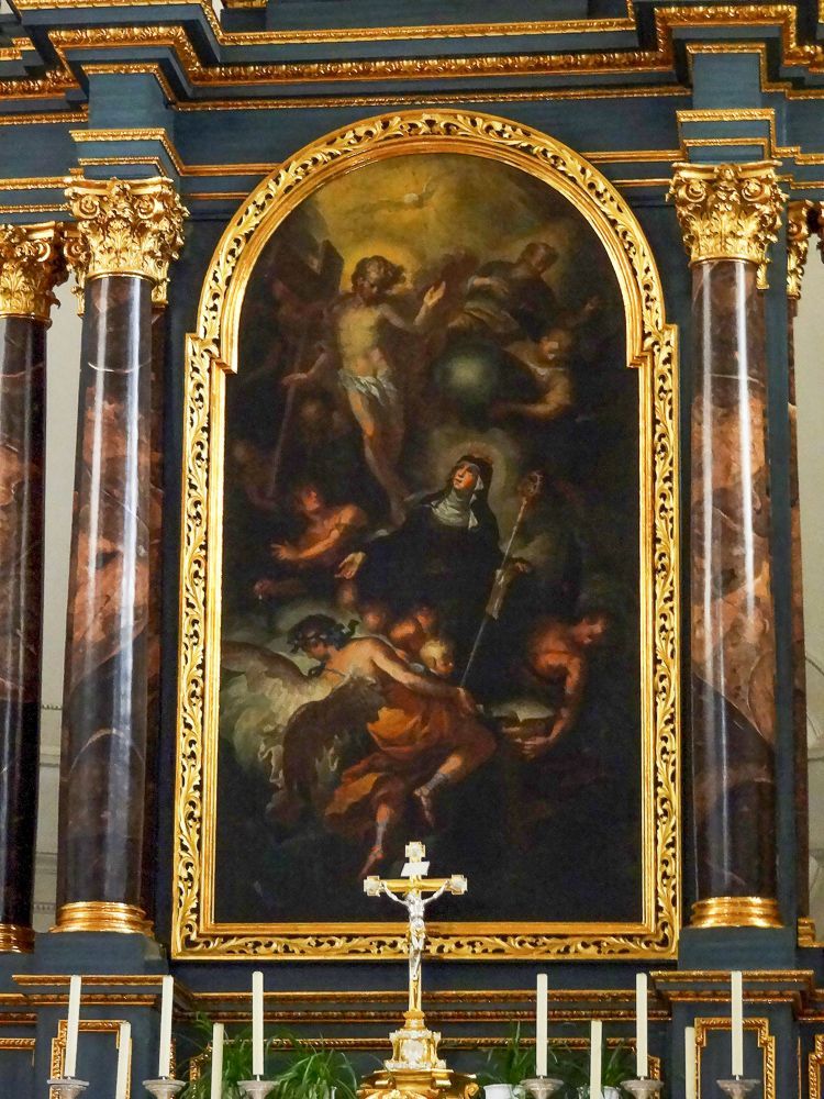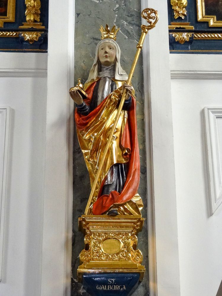 Im Innern glänzt die Kirche eher mit einer schlichten Barockausstattung, wodurch das helle und weite Kirchenschiff besser zur Entfaltung kommt. Der Chorraum beherbergt den vom Eichstätter Hofbaumeister Jakob Engel geschaffenen Hochaltar, der noch aus der zweiten Nachfolgerkirche (erbaut unter Fürstbischof Schenk von Castell) 1695 stammt. Auf dem Altarbild ist die "Verklärung der Hl. Walburga inmitten der Heiligsten Dreifaltigkeit" zu sehen; darüber das herzförmige Wappen des Fürstbischofs. Auf den gleichen Zeitraum lässt sich die mit filigranen Schnitzarbeiten verzierte Kanzel datieren. Vier weitere Seitenaltäre entstanden erst in den nachfolgenden Jahrhunderten.