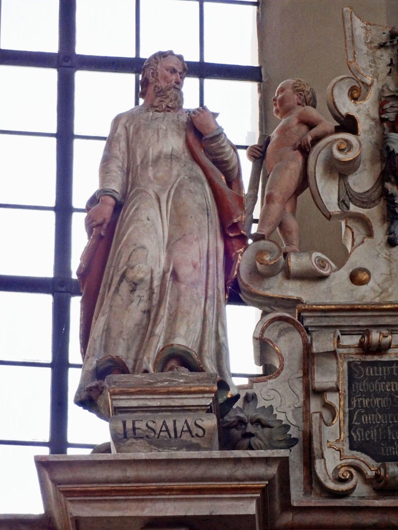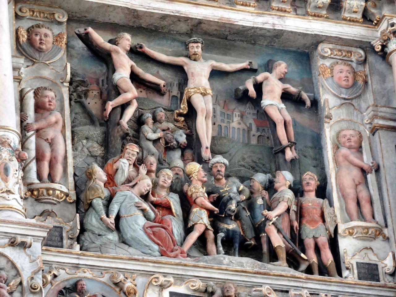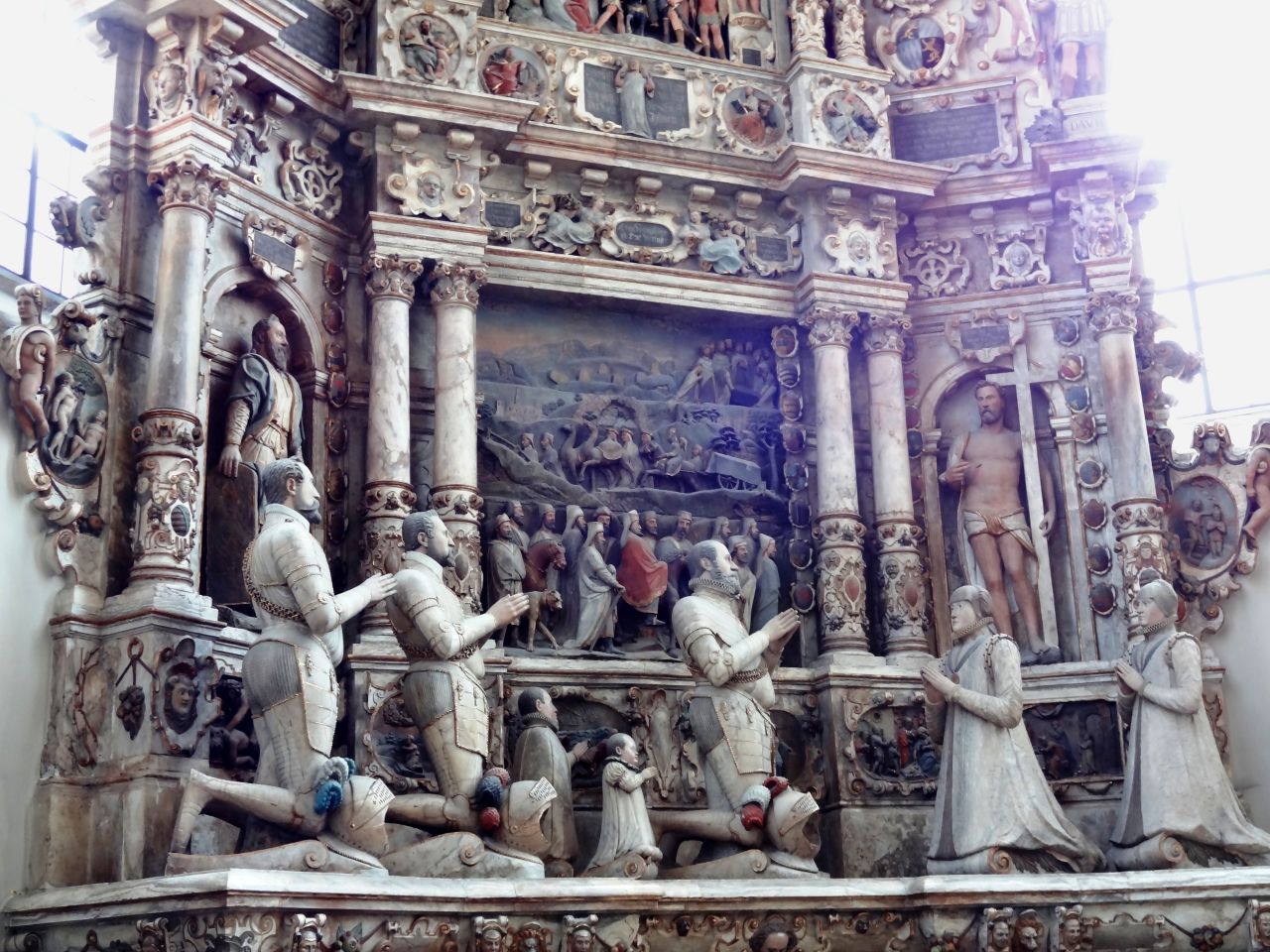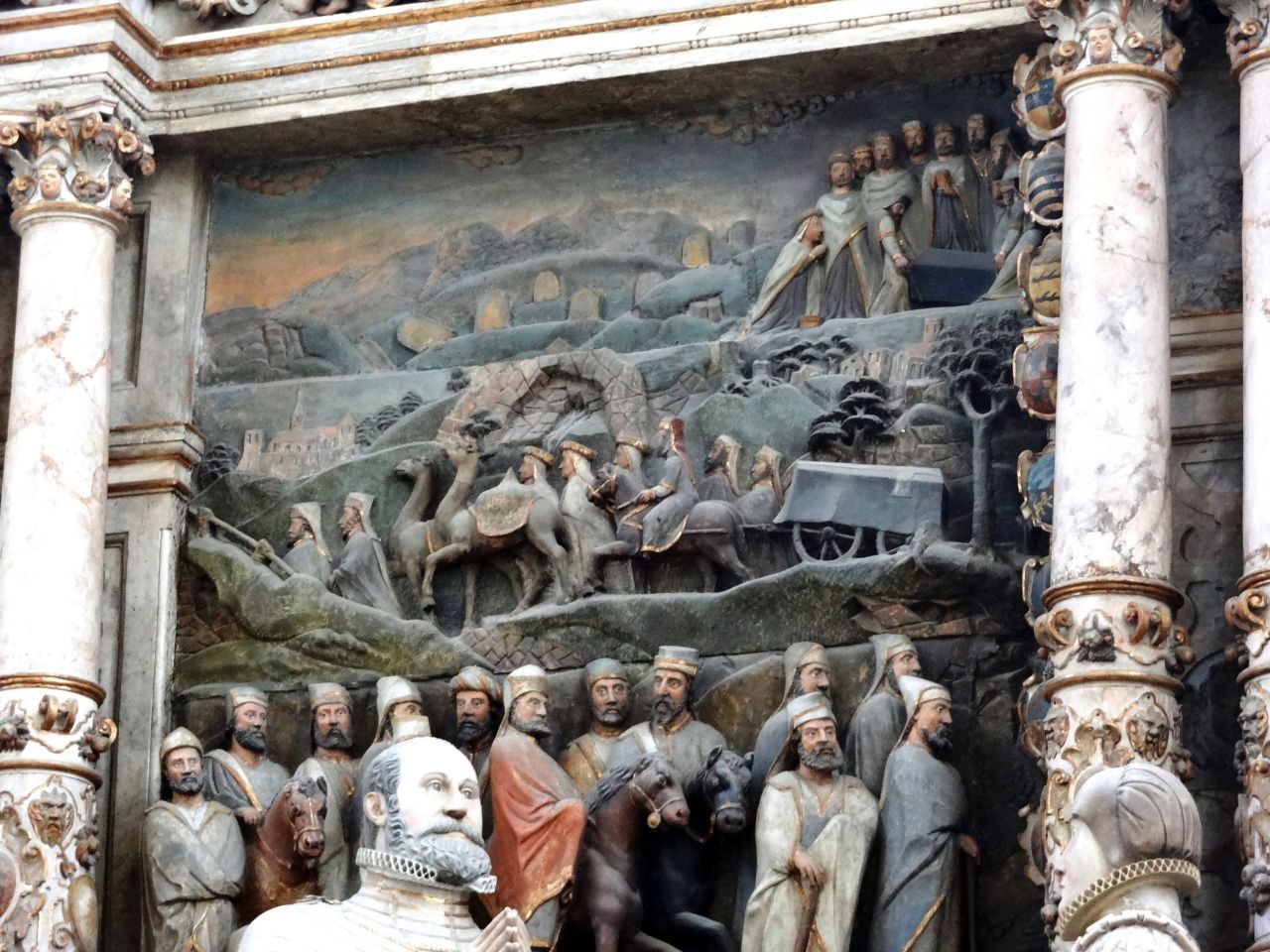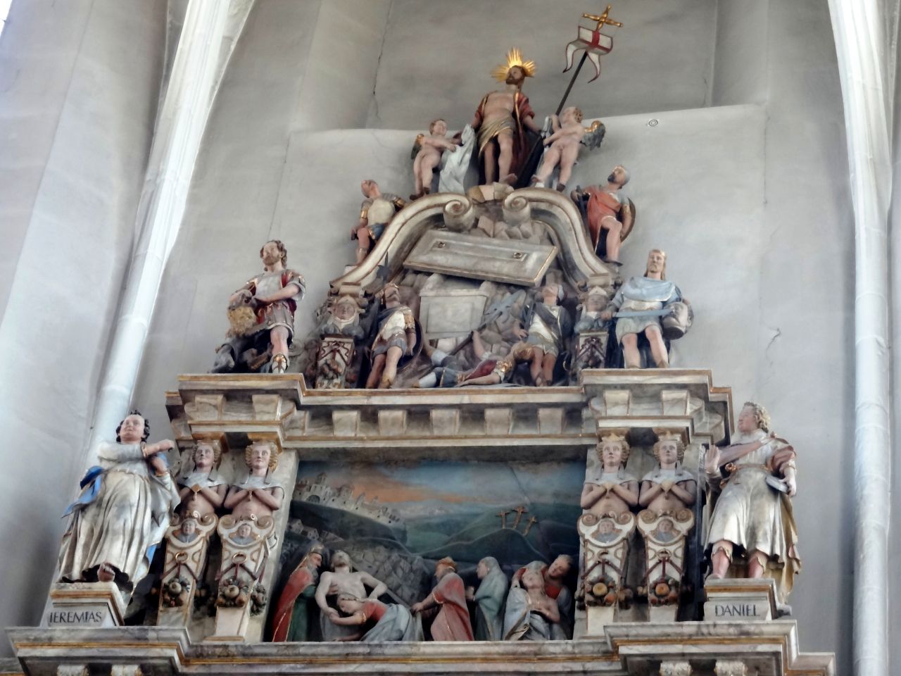 Das Grabmal vereint Altes und Neues Testament zugleich. Die Herzogsfamilie kniet auf dem Sockel, darüber die alt-testamentliche Szene; der Leichnam des Jakob wird von Ägypten nach Kanaan überführt (vergleichbar dazu, dass Johann Casimir seinen Eltern den selben Dienst erwies); zur Linken Mose mit den Gesetzestafeln, zur Rechten Jesus Christus mit Kreuz. Darüber die Kreuzigung Jesu, dann die Grablegung Jesu und darüber die Auferstehung Jesu. Die Figur des auferstandenen Christus ganz oben an der Spitze beschließt das Grabmal.