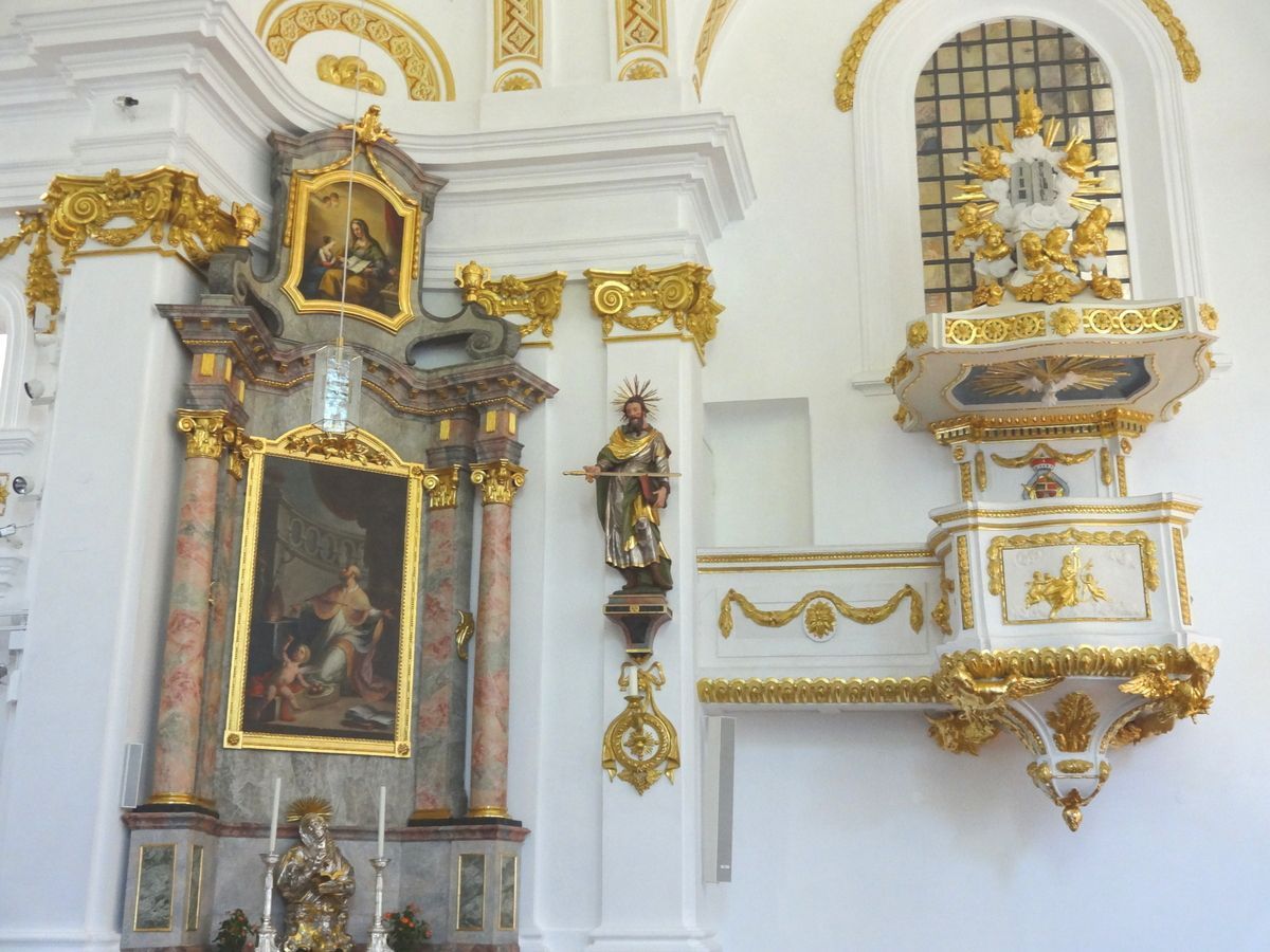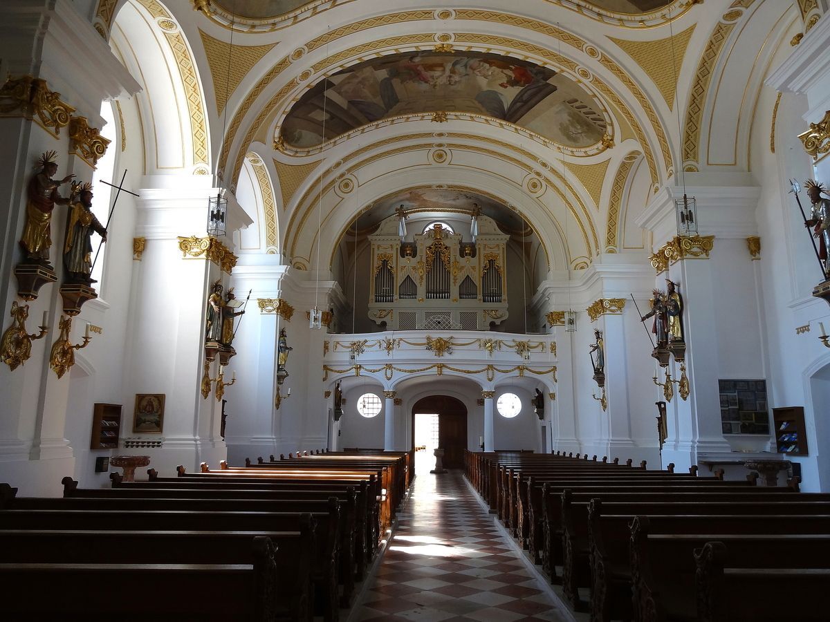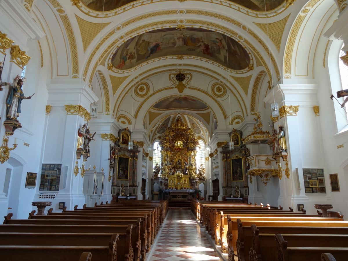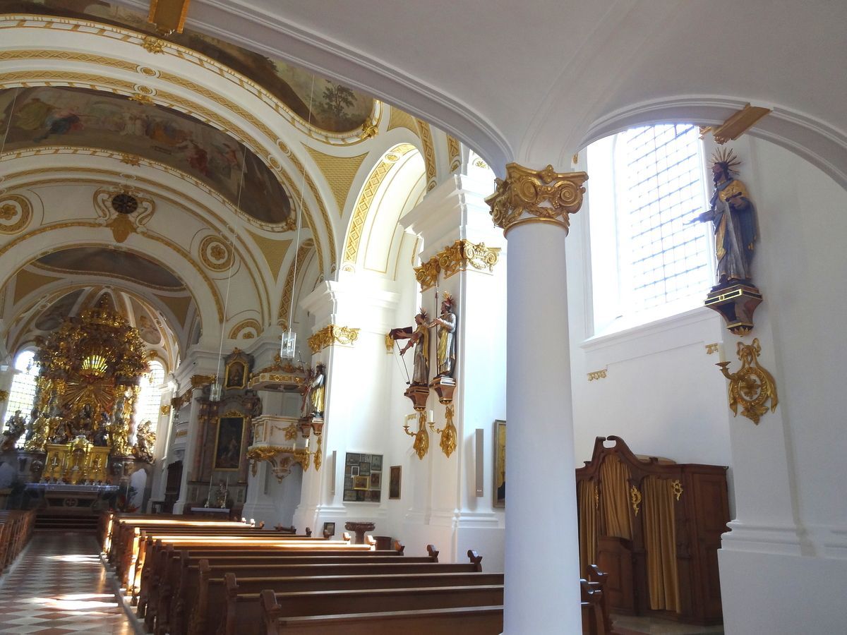 Im Innern des Gotteshauses dominiert die gold-weiße Farbgebung. Die klassizistischen Bögen verleihen Weite; der Einfall des Lichts von allen Seiten erfüllt den Raum mit Freundlichkeit und Wohlbefinden.