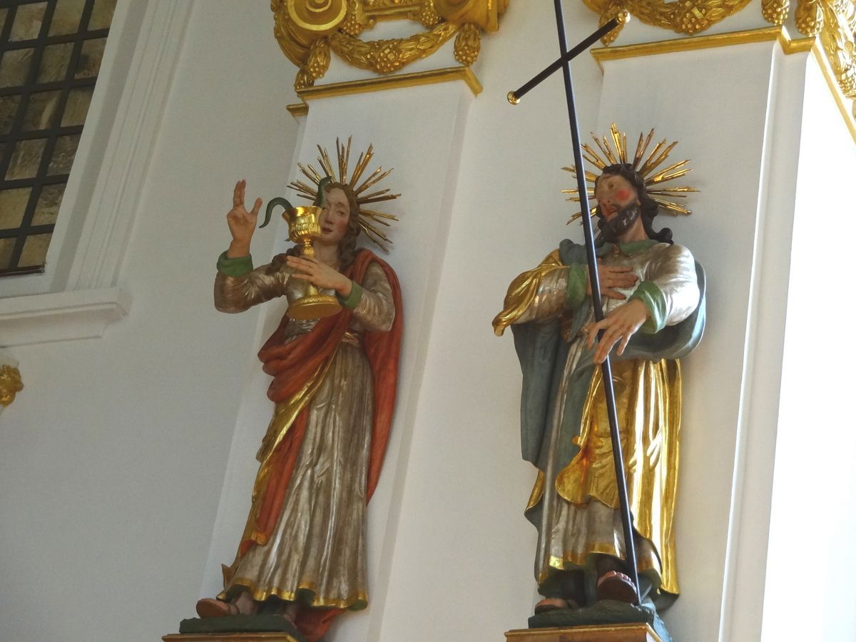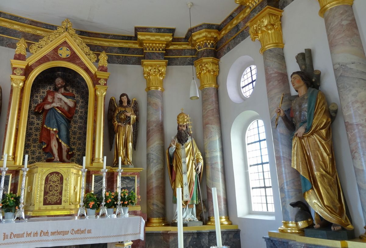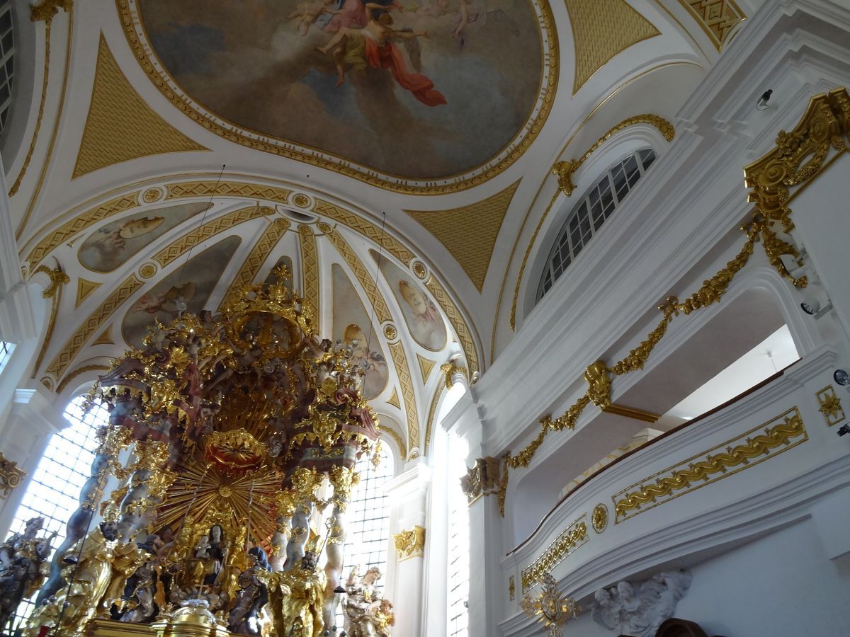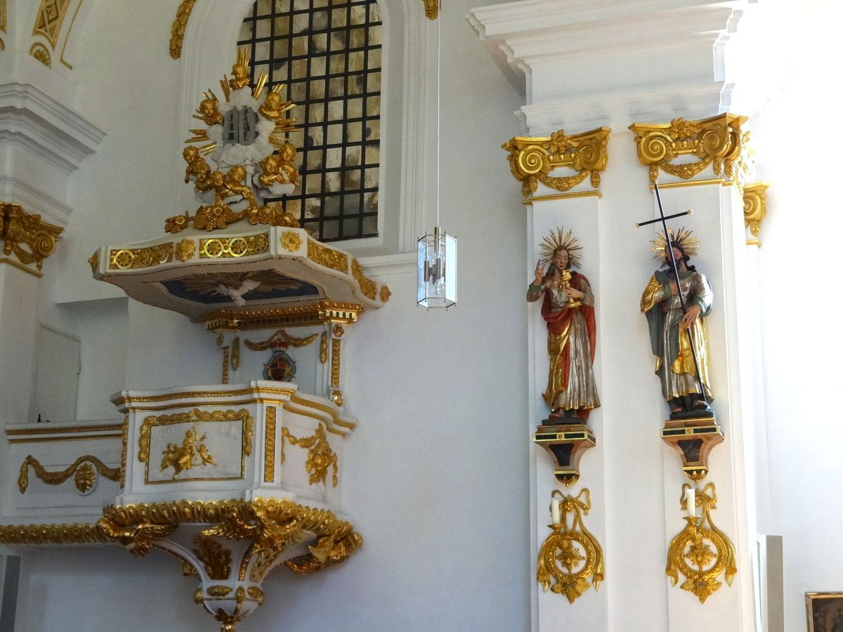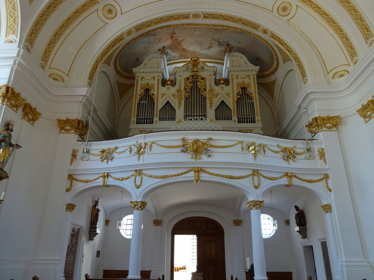 Im Innern des Gotteshauses dominiert die gold-weiße Farbgebung. Die klassizistischen Bögen verleihen Weite; der Einfall des Lichts von allen Seiten erfüllt den Raum mit Freundlichkeit und Wohlbefinden.