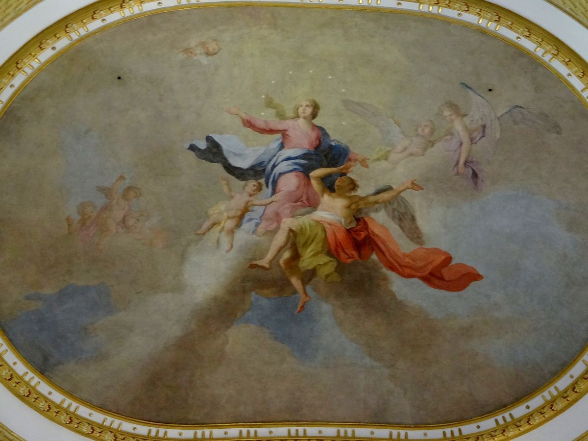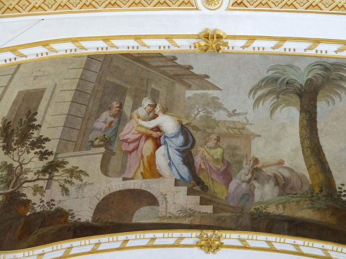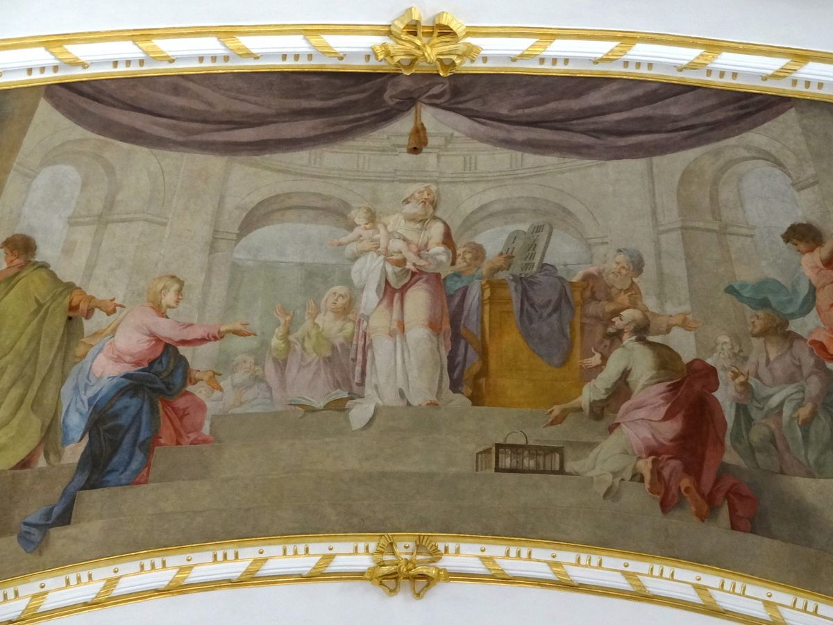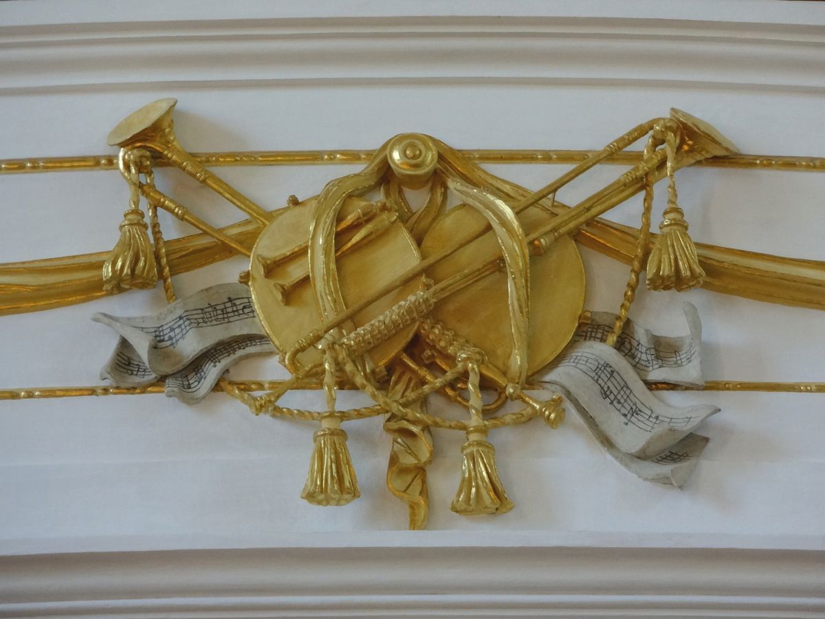 Im Innern des Gotteshauses dominiert die gold-weiße Farbgebung. Die klassizistischen Bögen verleihen Weite; der Einfall des Lichts von allen Seiten erfüllt den Raum mit Freundlichkeit und Wohlbefinden.