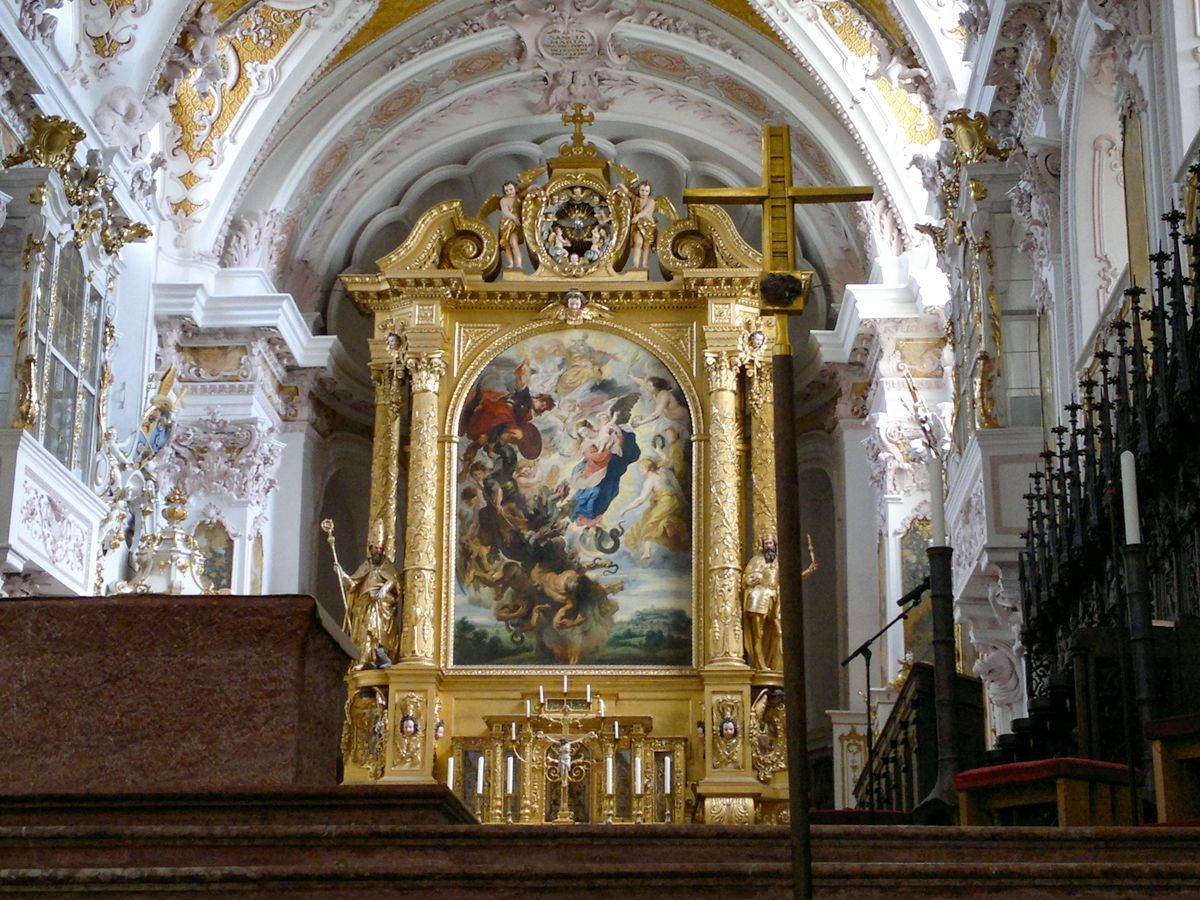 In Bezug auf die prächtige Ausstattung des Doms tritt der erhobene Hochaltar mit dem spätgotischem Chorgestühl links und rechts fast unscheinbar in den Hintergrund. Er ist ein Werk von Phillipp Dirr von 1625 und enthält eine Kopie (Original in Alter Pinakothek, München) des Gemäldes "Das apokalyptische Weib" von Peter Paul Rubens.