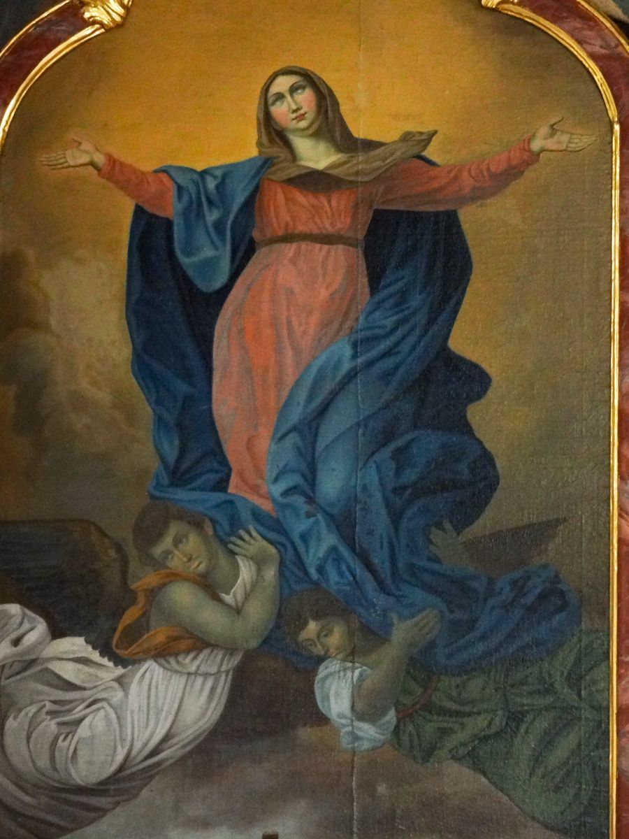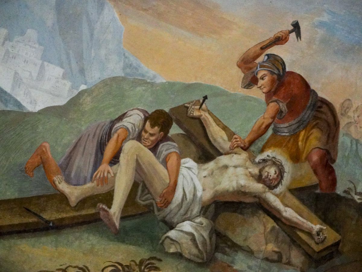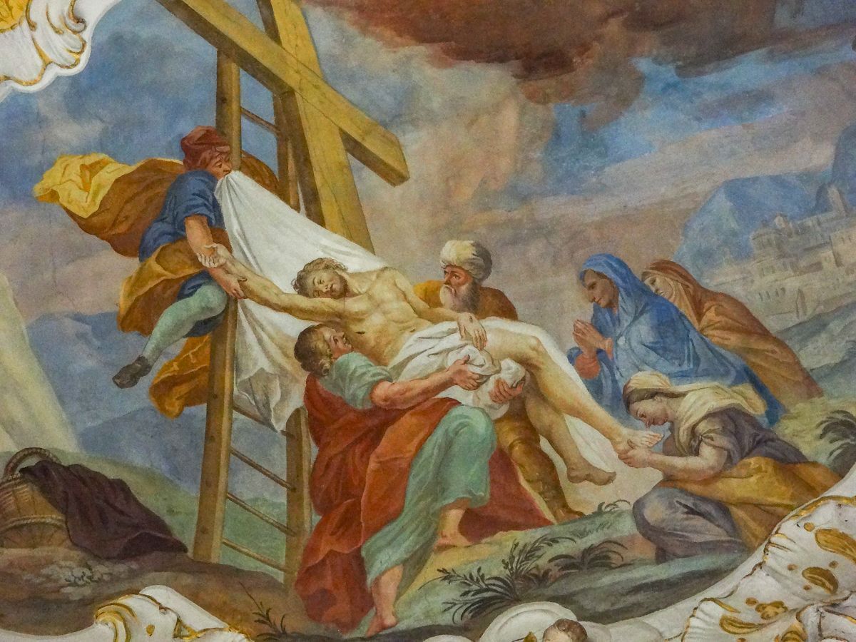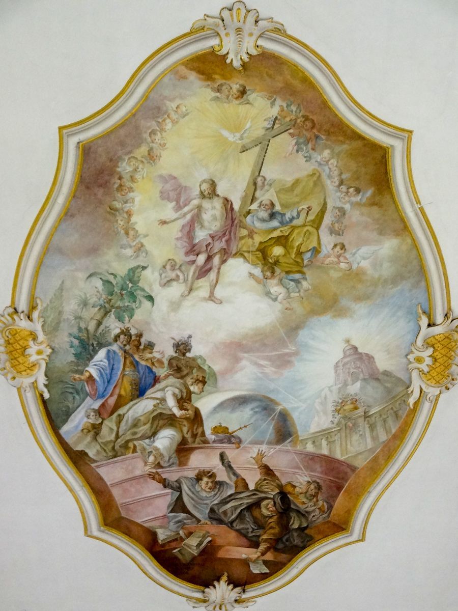 >> Deckenfresko von Johann B. Enderle: Szene aus dem Alten Testament "Abraham opfert Isaak" als Sinnbild für den Opfertod Jesu Christi im Neuen Testament