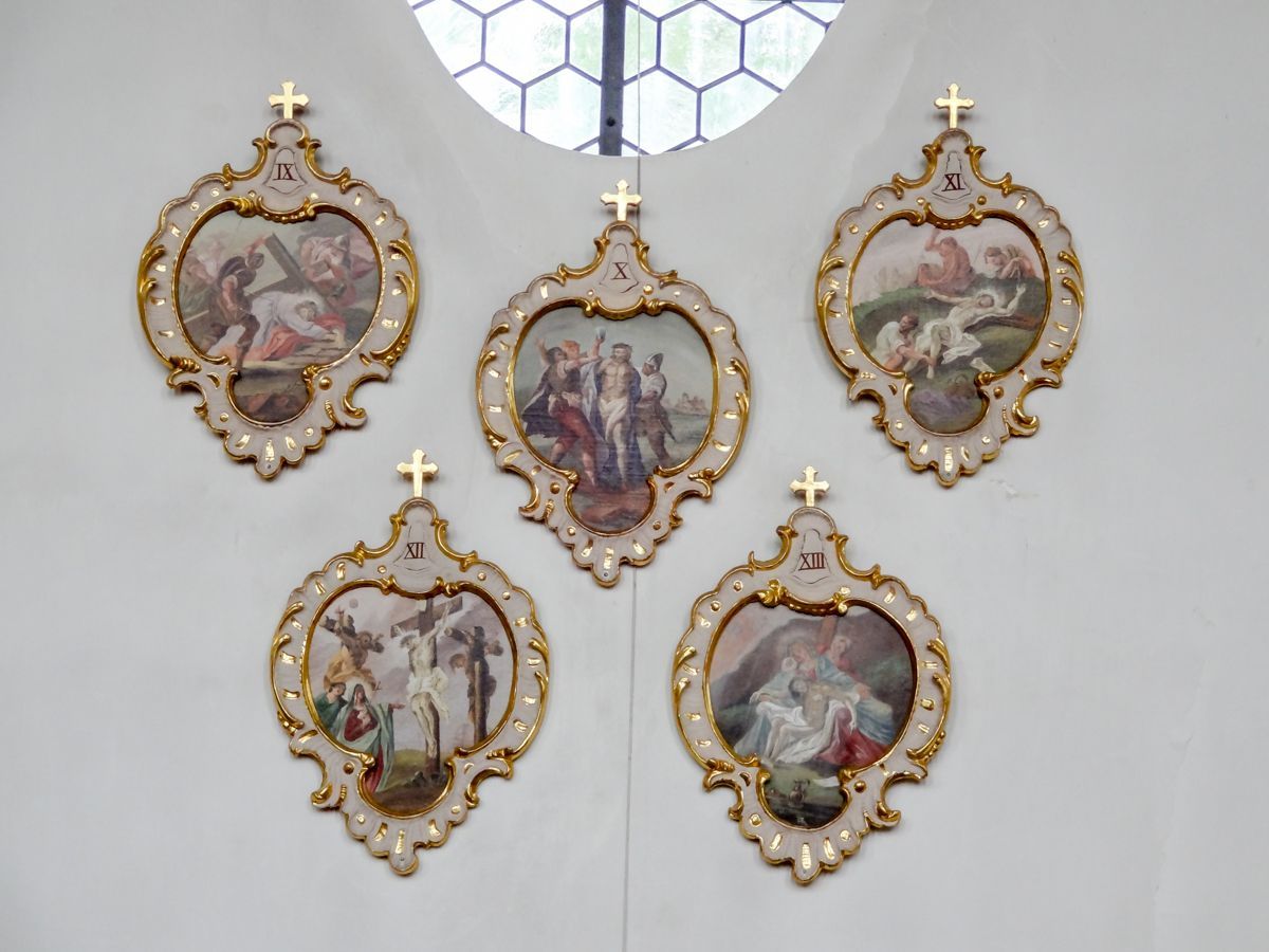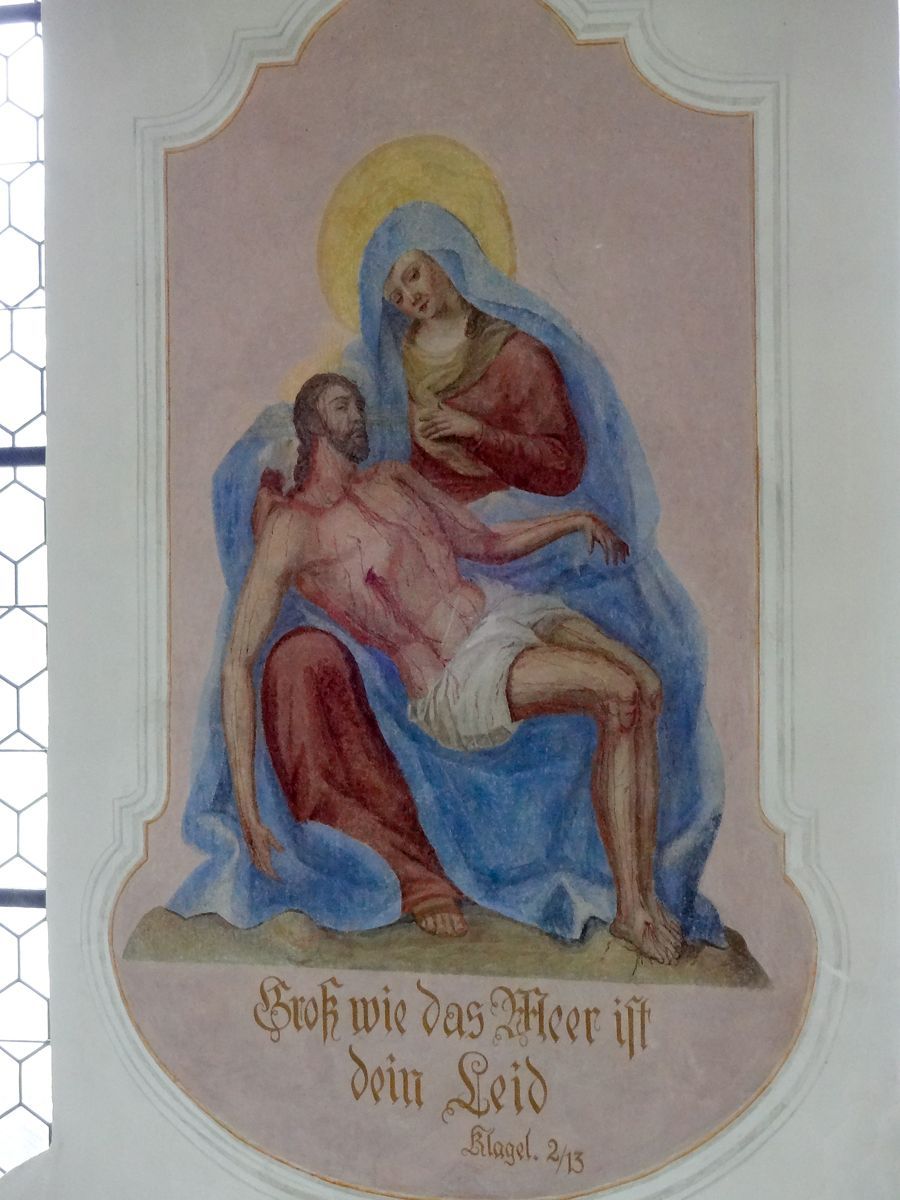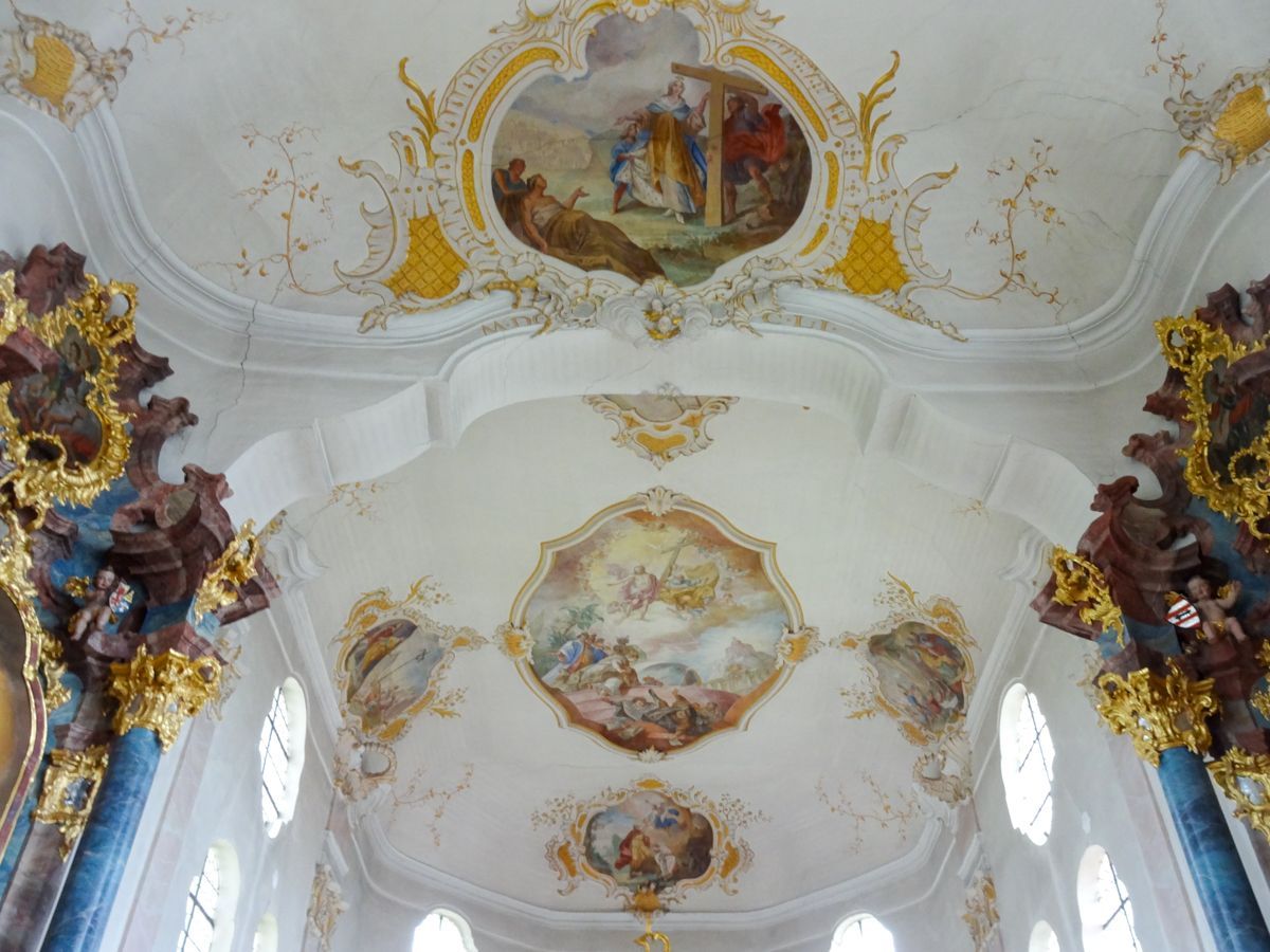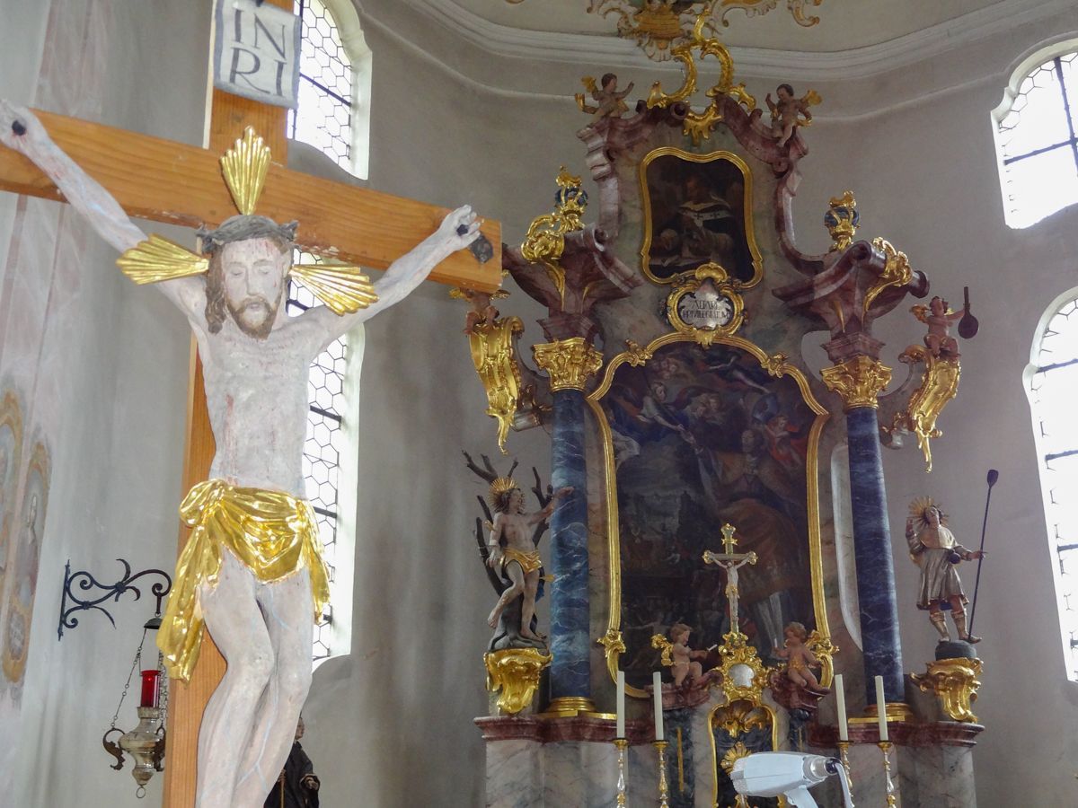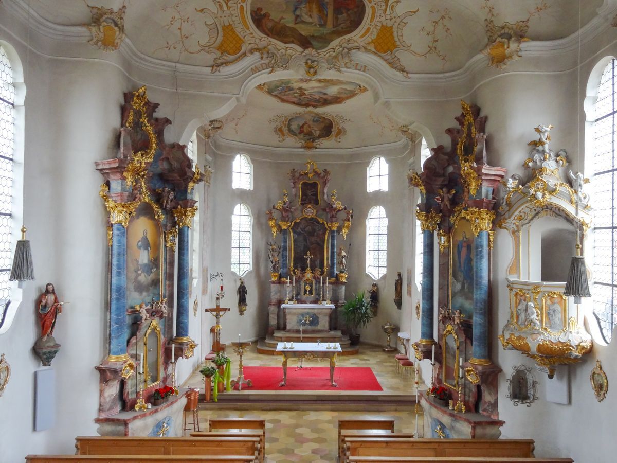 Im Innern glänzt die Kirche durch eine verspielte Rokoko-Ausstattung. Joseph Dossenberger orientierte sich dabei an den Sakralbauten von Domenikus Zimmermann. Durch große Fenster im Chorraum und Langhaus gelangt besonders viel Licht in den Innenraum, um die schwungvolle und farbenfrohe Rokokopracht erstrahlen zu lassen. Der Freskenzyklus stammt vom Rokoko-Maler Johann Baptist Enderle und fokussiert besonders das Leiden und Sterben Jesu am Kreuz, das schließlich im großen Deckenfresko in der glorreichen Auferstehung Christi zur Vollendung gelangt.
