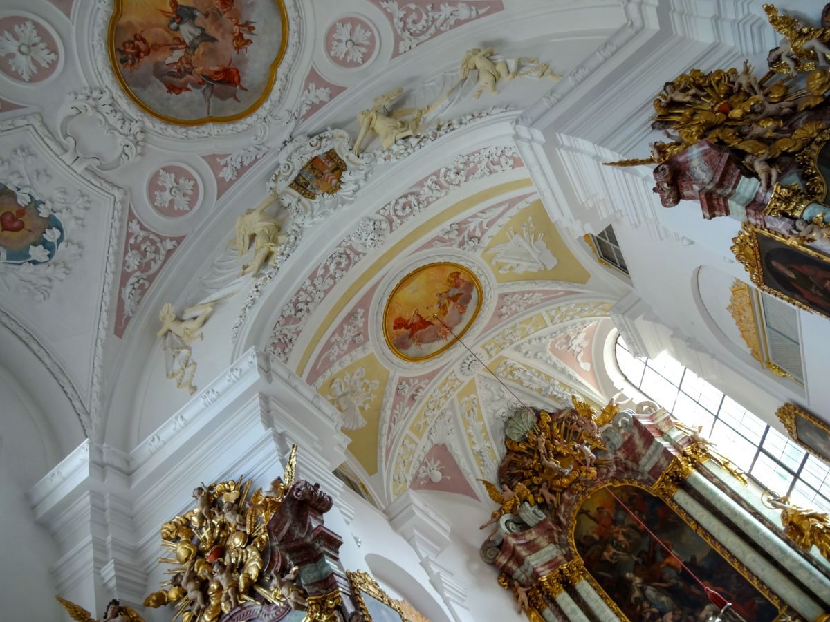 Das gesamte Deckengewölbe ist prachtvoll mit Ornamenten in Blatt- und Rosenformen stuckiert. Einzelne Gemälde erzählen aus dem Leben der Hl. Angela Merici - der Gründerin des Ursulinenordens.