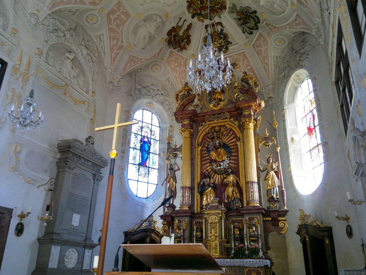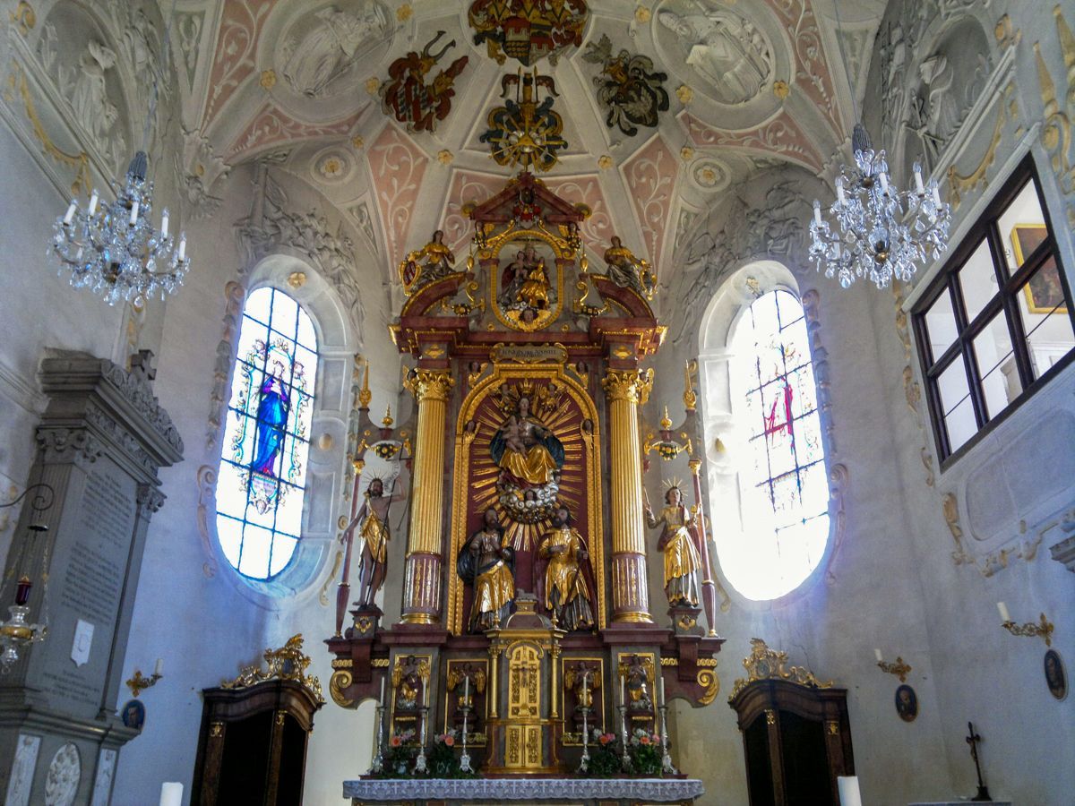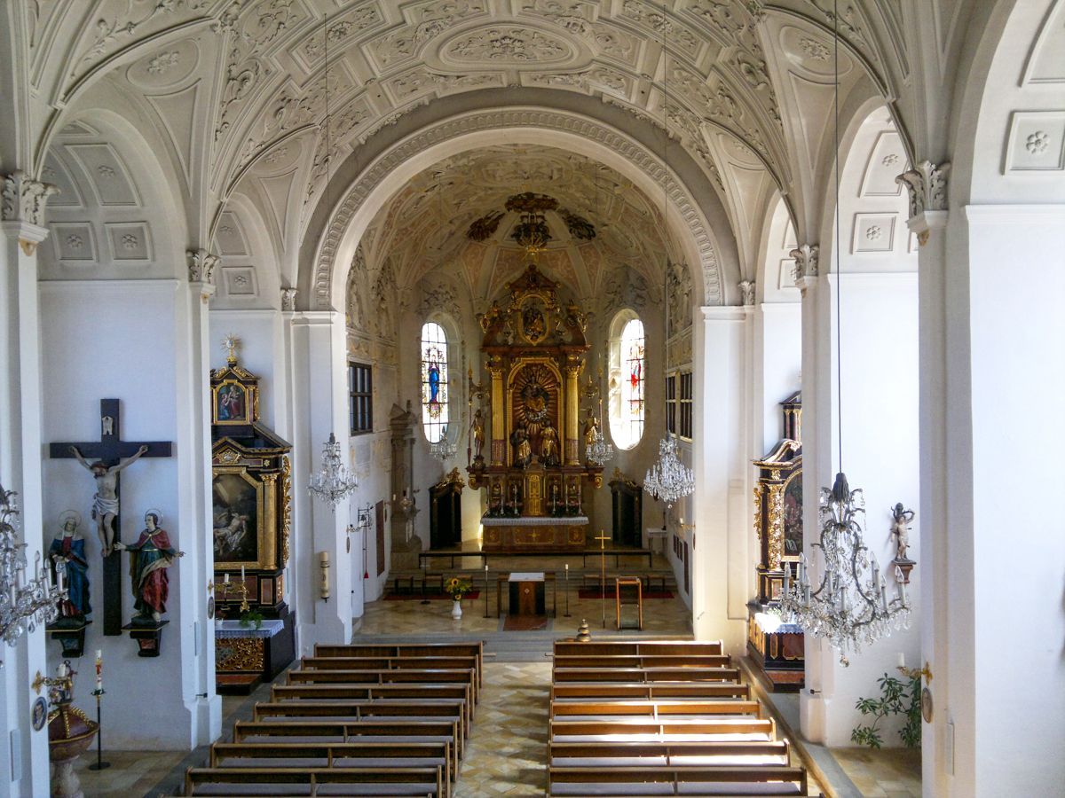BESCHREIBUNG: Abt Johann IV. von Niederalteich ließ das Gotteshaus im Renaissancestil während des Dreißigjährigen Krieges von 1624-1628 erbauen. Die Kirche wurde auf das Patronat der beiden Apostel Simon und Judas Thaddäus geweiht, die im Hochaltar unter Maria, der "Königin der Apostel", dargestellt sind. Weiße Stuckornamente und -reliefs im Deckengewölbe ziehen sich vom Chor bis zur Doppelempore und verleihen der Kirche eine geschmeidige Eleganz. Besonders wunderschön anzusehen sind auch die beiden barock gestalteten Seitenaltäre - links, das Martyrium des Hl. Sebastian - rechts, die geistige Vermählung der Hl. Katharina mit dem Jesuskind.
