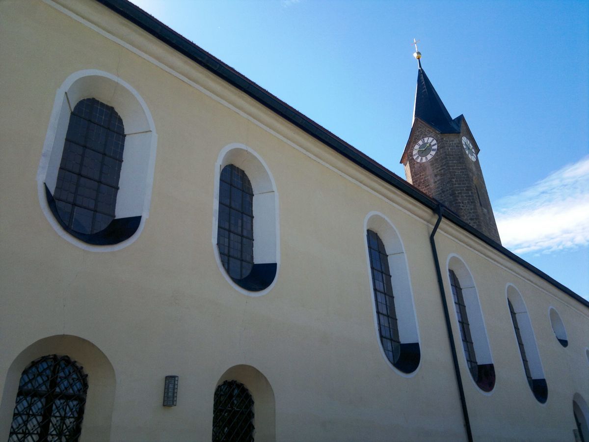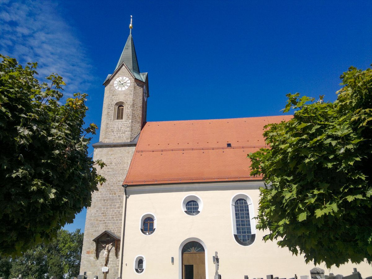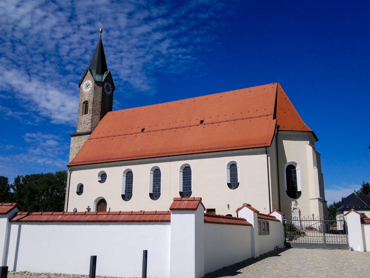 LAGE: Wer auf der B8 zwischen Plattling und Osterhofen unterwegs ist, dem fällt die von außen etwas ungewöhnlich erscheinende Pfarrkirche Simon und Judas Thaddäus sofort auf. Zur Pfarrei Isarhofen gehörend - liegt die Kirche beschaulich am Ortsrand von Moos.