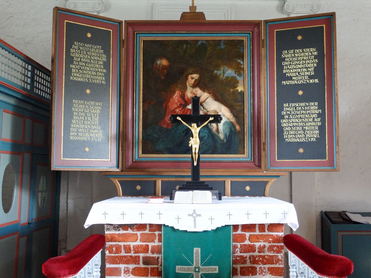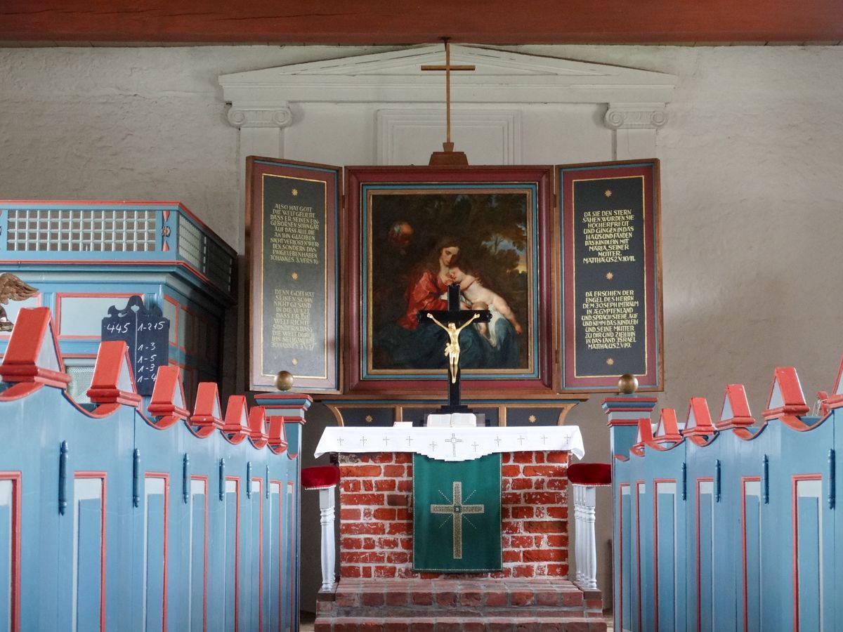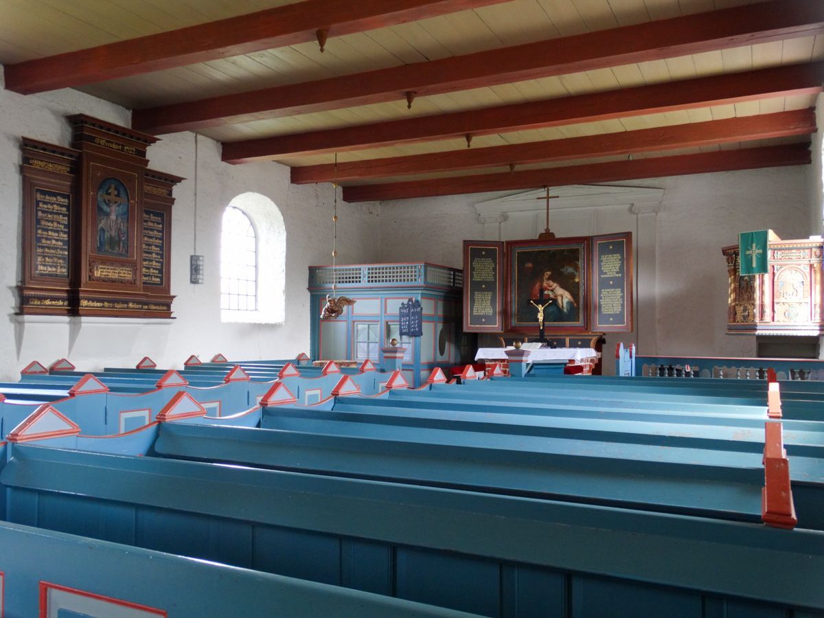 Der Innenraum der kleinen Dorfkirche ist schlicht und einfach gehalten, jedoch haben einige Ausstattungsgegenstände historischen Wert, z.B. der Taufstein aus Sandstein aus dem 12. Jhdt. (ältester Taufstein Eiderstedts), die Kanzel und Teile des Gestühls von 1600. Das Hauptaltargemälde ist eine Kopie des Meisterwerkes "Die heilige Familie" von Anthonis van Dyck, gemalt von Jacob Alberts.