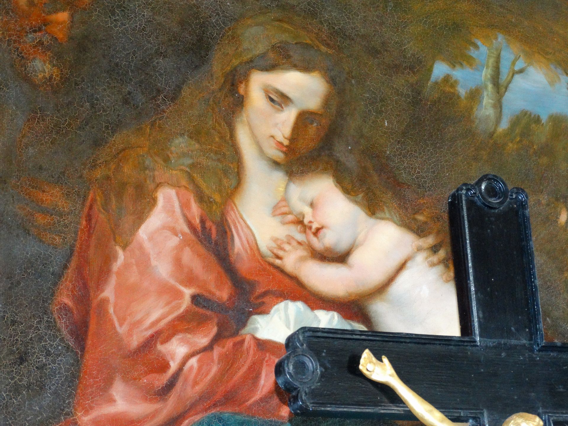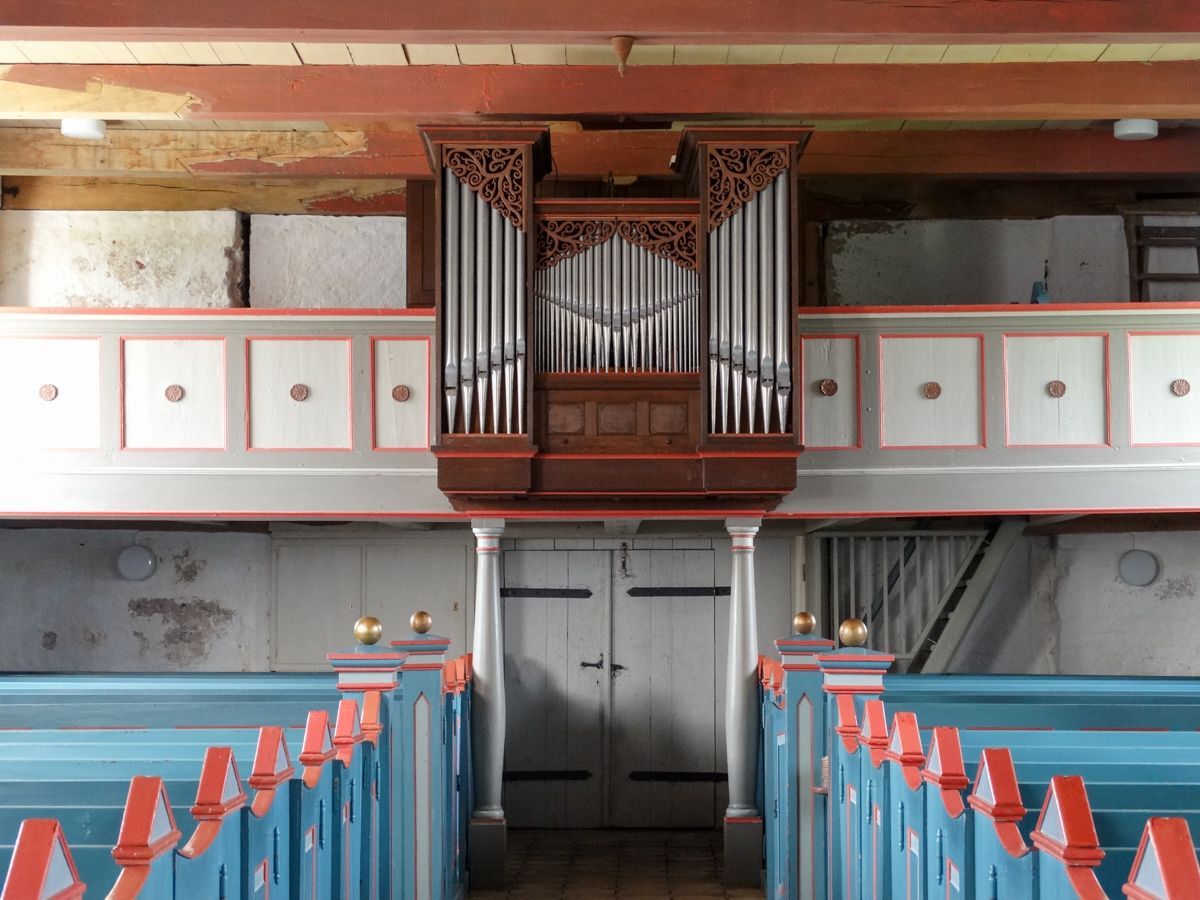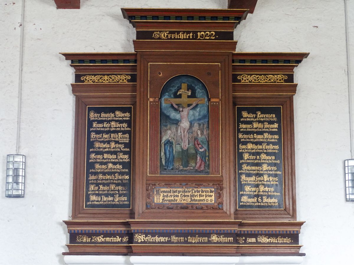 Der Innenraum der kleinen Dorfkirche ist schlicht und einfach gehalten, jedoch haben einige Ausstattungsgegenstände historischen Wert, z.B. der Taufstein aus Sandstein aus dem 12. Jhdt. (ältester Taufstein Eiderstedts), die Kanzel und Teile des Gestühls von 1600. Das Hauptaltargemälde ist eine Kopie des Meisterwerkes "Die heilige Familie" von Anthonis van Dyck, gemalt von Jacob Alberts.